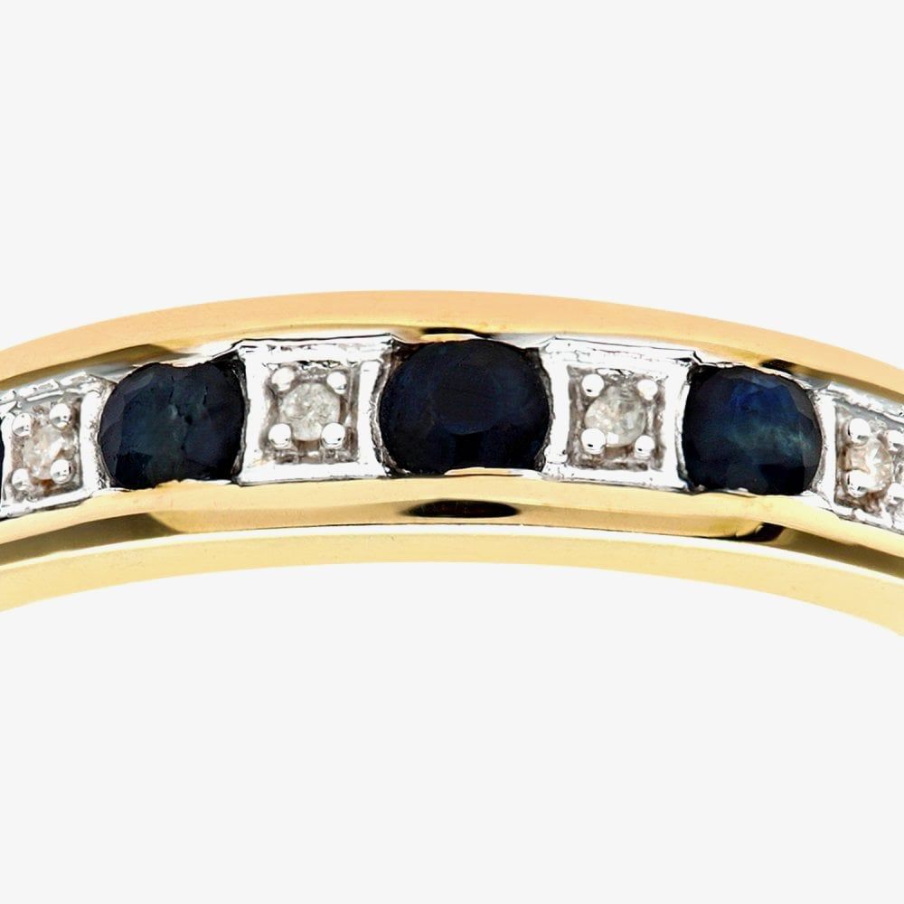 This traditional half eternity ring is crafted in 9ct yellow gold & features five blue sapphires & six sparkling diamonds with a total carat weight of 0.02ct. This ring is a perfect stand-alone piece or ideal for layering & combining with other rings to create your own unique look.