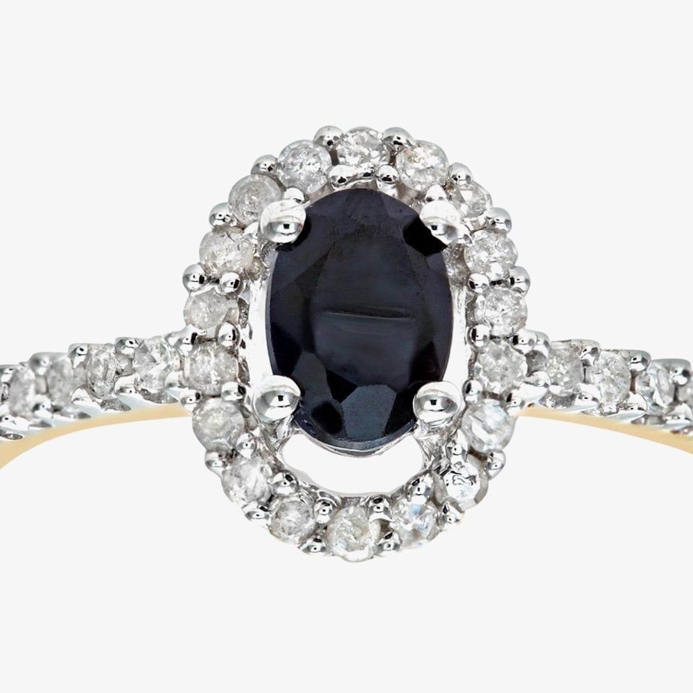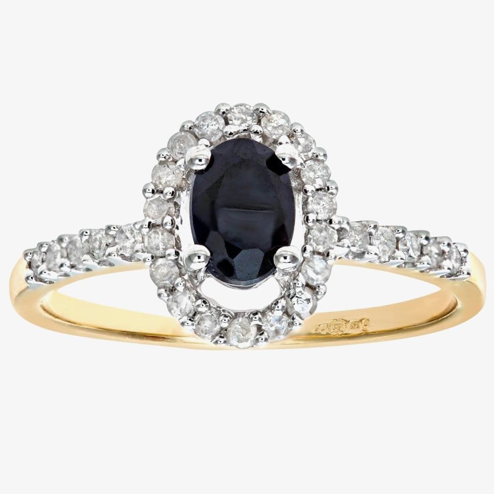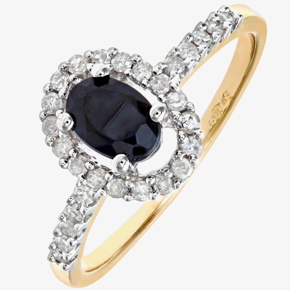 This traditional cluster ring is crafted in 9ct yellow gold & features an oval sapphire centre stone with a sparkling diamond halo surround which has a total carat weight of 0.25ct. This ring is a perfect stand-alone piece or ideal for layering & combining with other rings to create your own unique look.