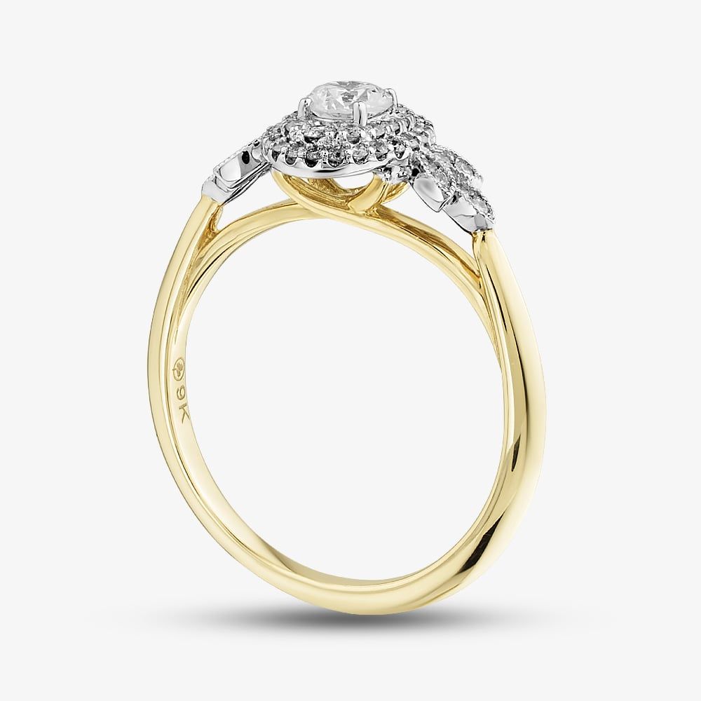 Elegant and sparkling, this 9ct Yellow Gold Oval Cluster Ring features a certificated 0.23ct round-cut white diamond centre stone surrounded by two rows of diamonds. The diamond-accented leaf-design shoulders add a delicate, nature-inspired touch, while the polished 9ct yellow gold band completes this timeless and sophisticated ring, perfect for special occasions.