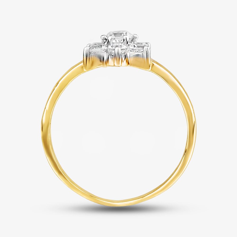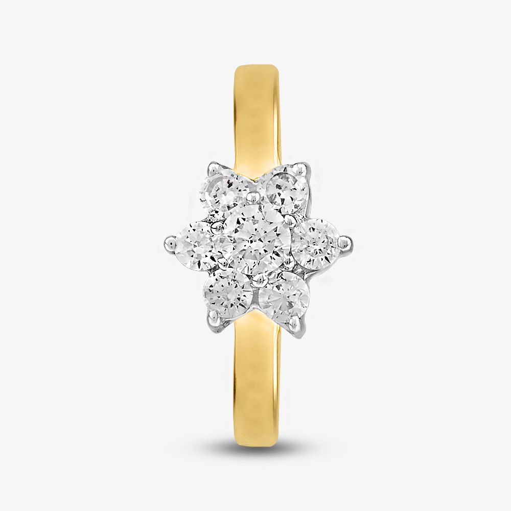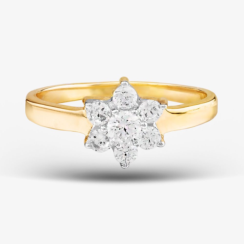 A simple yet classic cluster ring crafted in 9ct yellow gold with seven claw set sparkling round clear crystal stones which are in a flower design. This ring glistens and catches the light beautifully, the perfect dress ring for that special occasion.