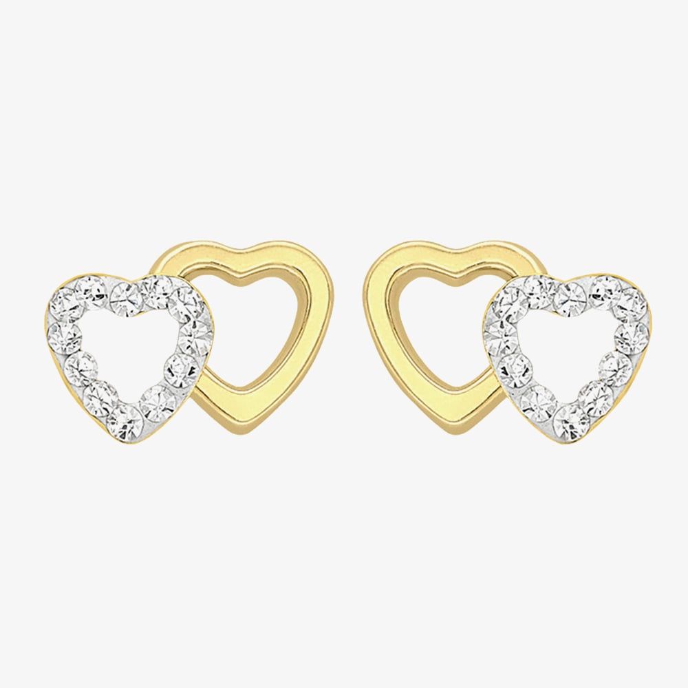 These adorable stud earrings are created from 9ct yellow gold & feature a 11 x 7 mm double heart design with a larger polished heart along with a cubic zirconia pave set smaller heart & they are completed on a post & butterfly back fastening.