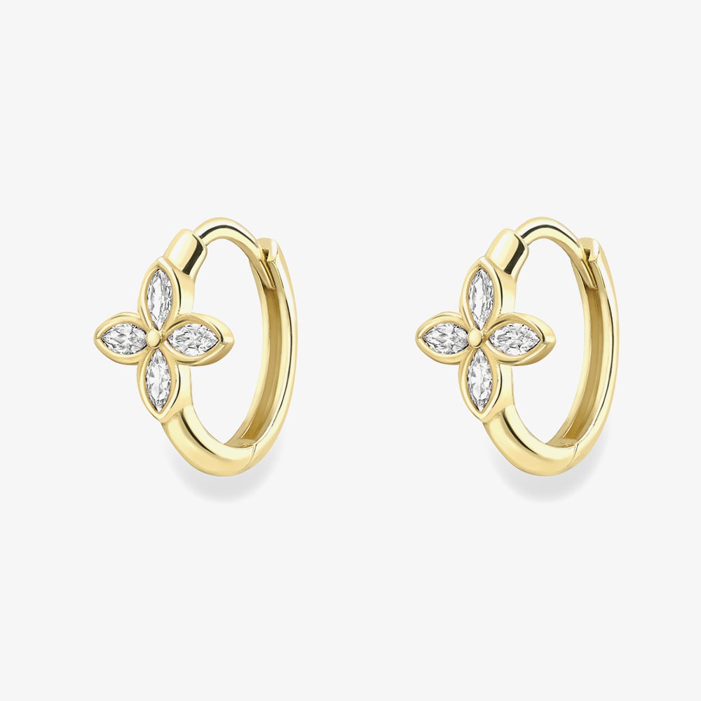 Turn heads with these 9ct yellow gold huggie earrings, featuring a classic round design with a highly polished finish and a charming flower motif set with four marquise-cut cubic zirconia stones. Measuring 10x10mm, they add a sparkling, versatile touch to any outfit, perfect for elevating both day and evening looks.