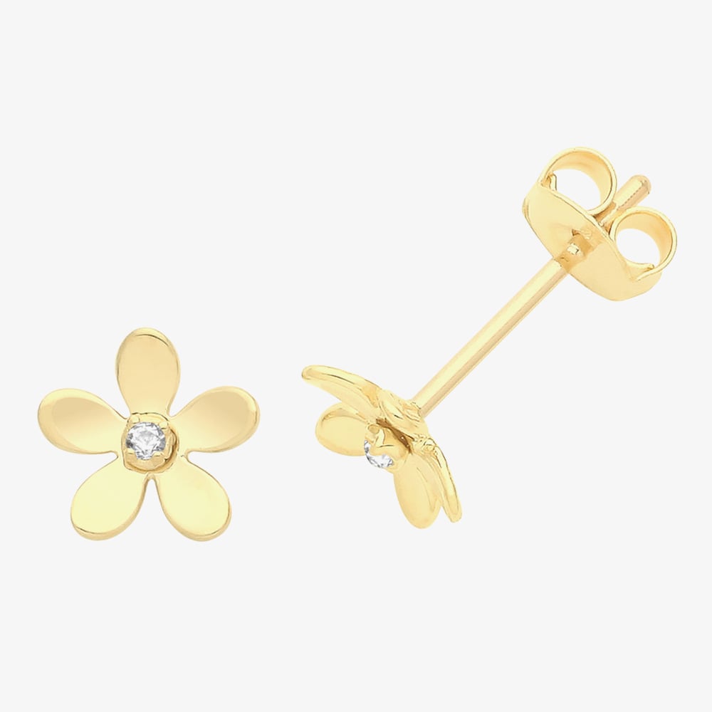 Crafted from fine 9ct yellow gold into a delicate flower motif, these stud earrings have a minimalistic design that looks on trend all year round. The flowers are delicately set with white cubic zirconia for a touch of sparkle. Post and butterfly secure fastenings make these earrings suitable for every day wear and can easily be adjusted to be tightened.