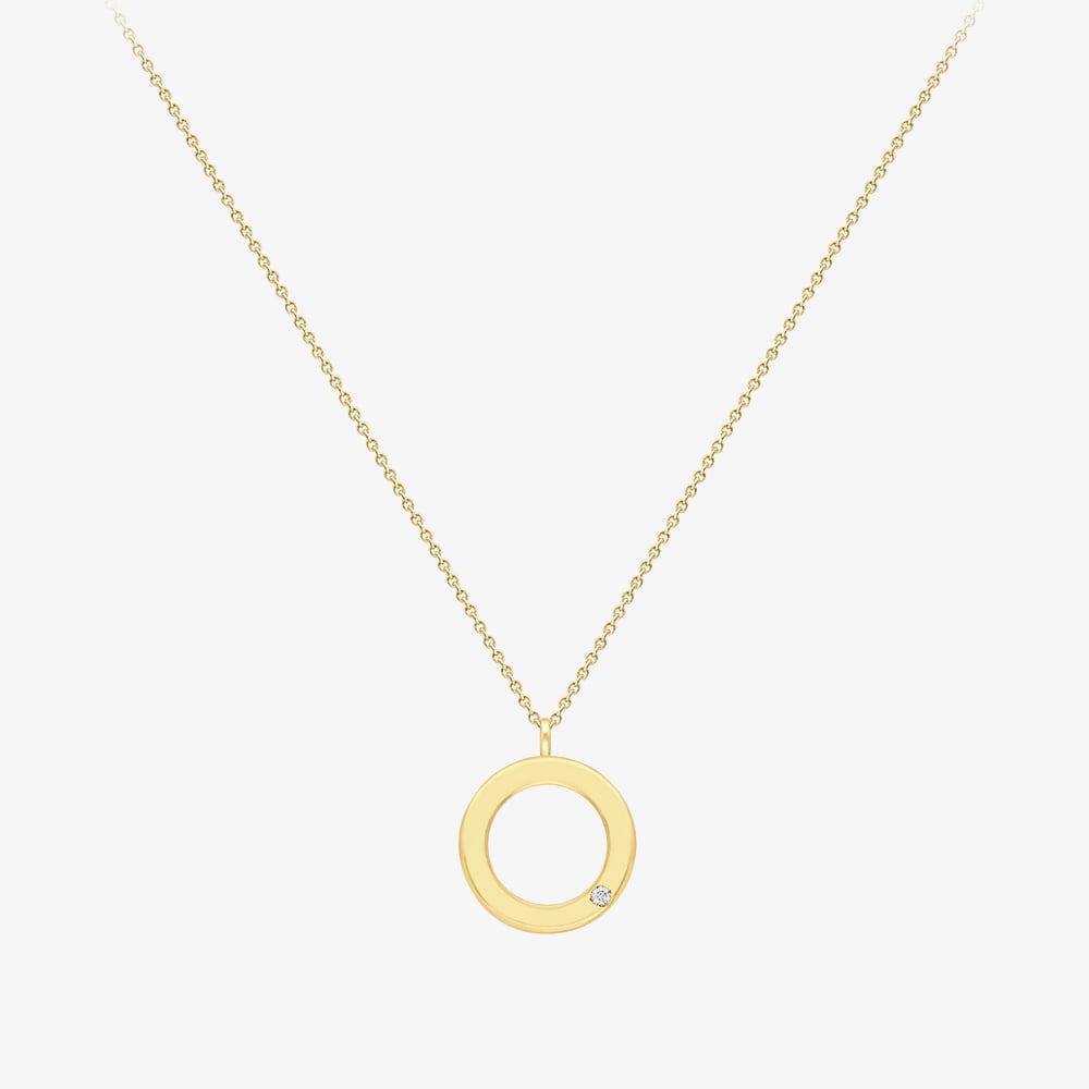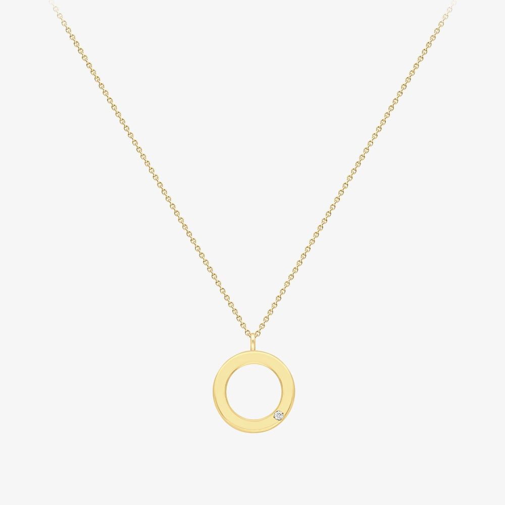 Elegant and timeless, this 9ct yellow gold necklace features a sleek open circle pendant adorned with sparkling diamonds. Suspended from a fine chain, the design symbolises eternity and unity, making it a meaningful and stylish addition to any jewellery collection.