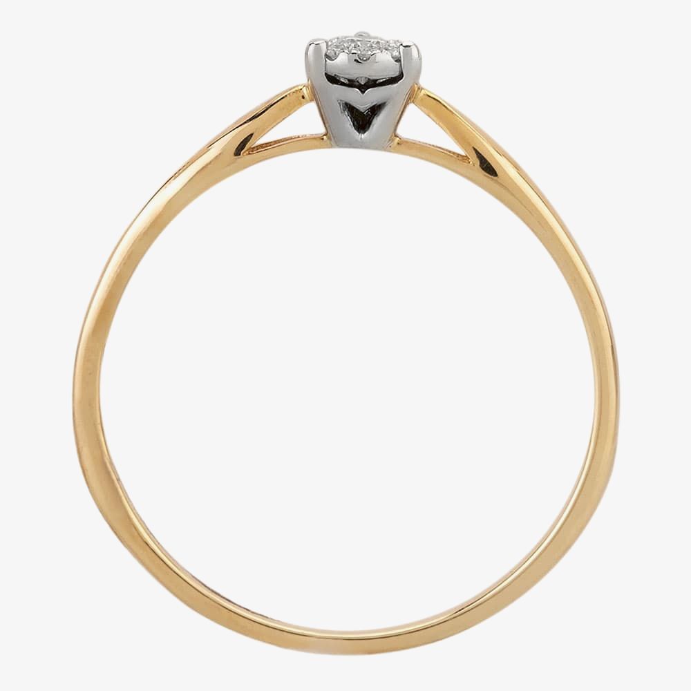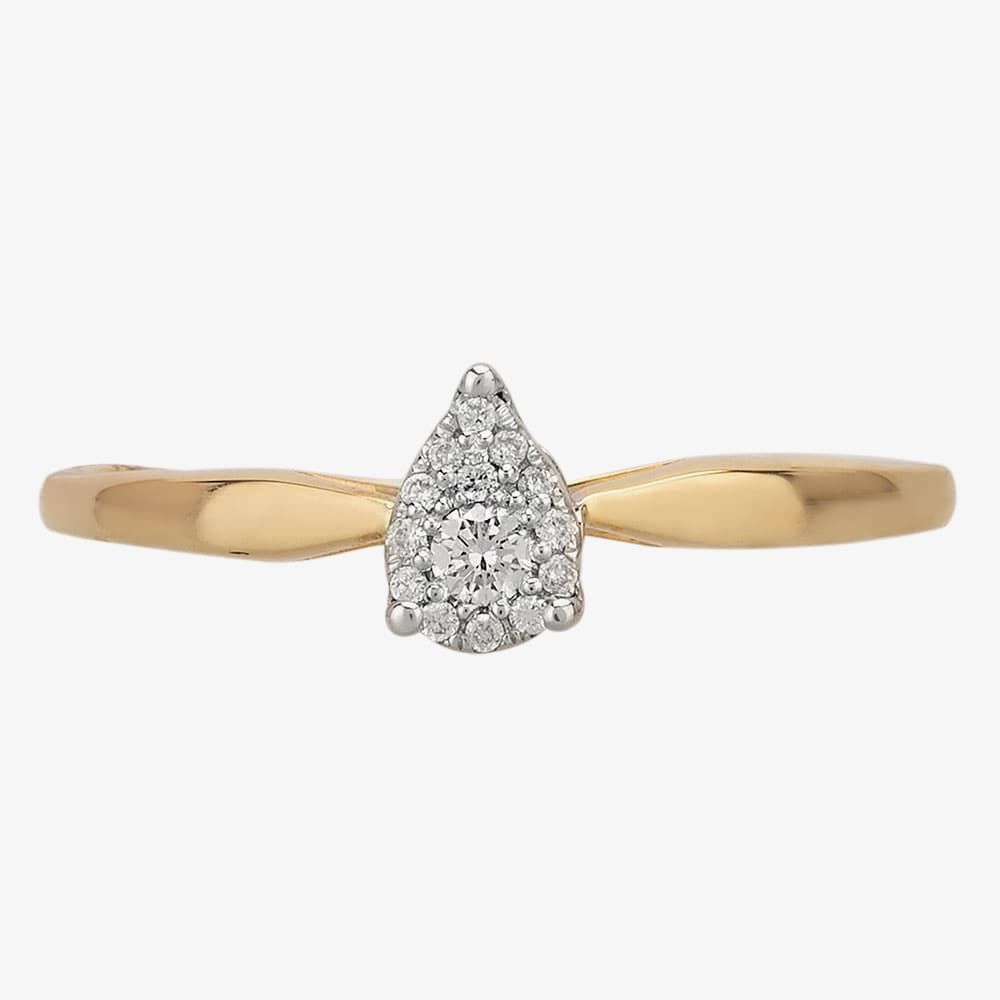 A diamond cluster ring, where a white gold V-basket head has been attached to a 9ct yellow gold shank to create the mount. A central 0.08ct round brilliant diamond has been given a pavé-set halo of graduated smaller diamonds to create the pear cluster, which is decorated with three claws to give the illusion of a larger martini-set single stone.