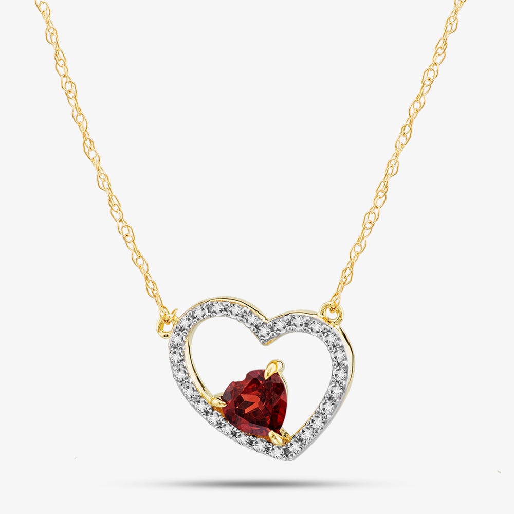 Beautifully crafted in warm 9ct yellow gold, this elegant necklace features a striking double heart pendant. The outer heart is adorned with shimmering white diamonds, creating a graceful frame that catches the light from every angle. Nestled within is a second, smaller heart set with a rich, deep red garnet, its bold colour adding a touch of passion and warmth to the piece. Suspended from a fine yellow gold chain, this pendant is a timeless symbol of love and connection, perfect for gifting or treasuring for yourself.