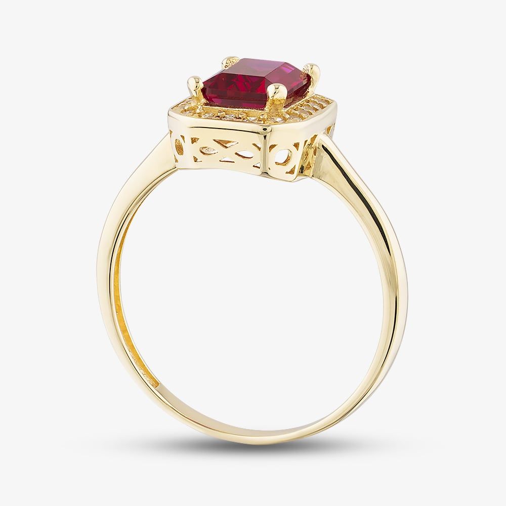 This elegant 9ct gold ring features a rich red emerald-cut cubic zirconia at its centre, surrounded by a halo of white brilliant-cut stones in a timeless cluster design. An intricate cut-out setting beneath the stone allows light to shine through, enhancing its sparkle. A refined and eye-catching piece, perfect for any occasion or gift for someone special.
