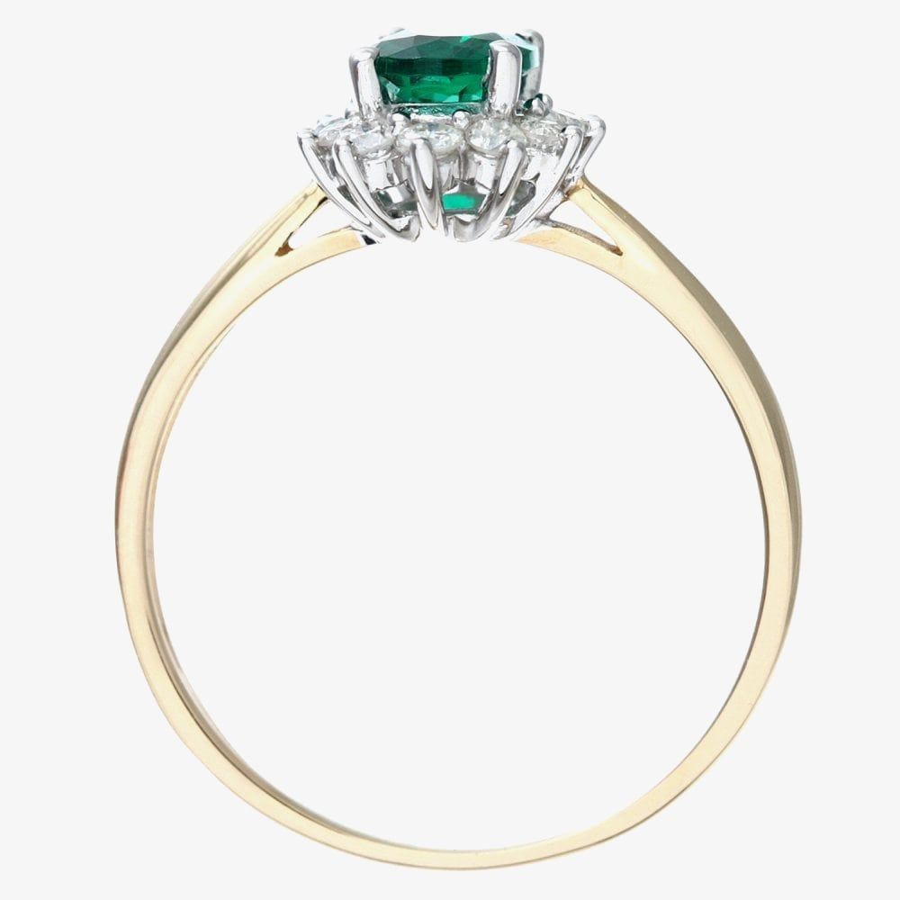 This beautiful cluster ring is crafted in 9ct yellow gold & features an oval emerald centre stone with a sparkling diamond surround which has a total carat weight of 0.25ct. This ring is a perfect stand-alone piece or ideal for layering & combining with other rings to create your own unique look.