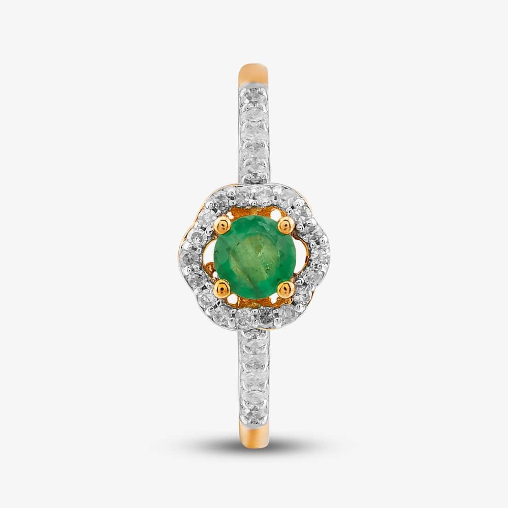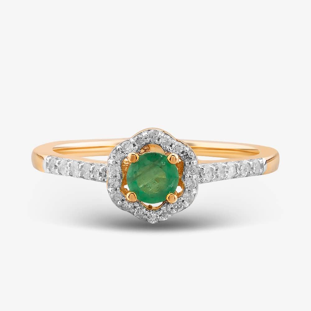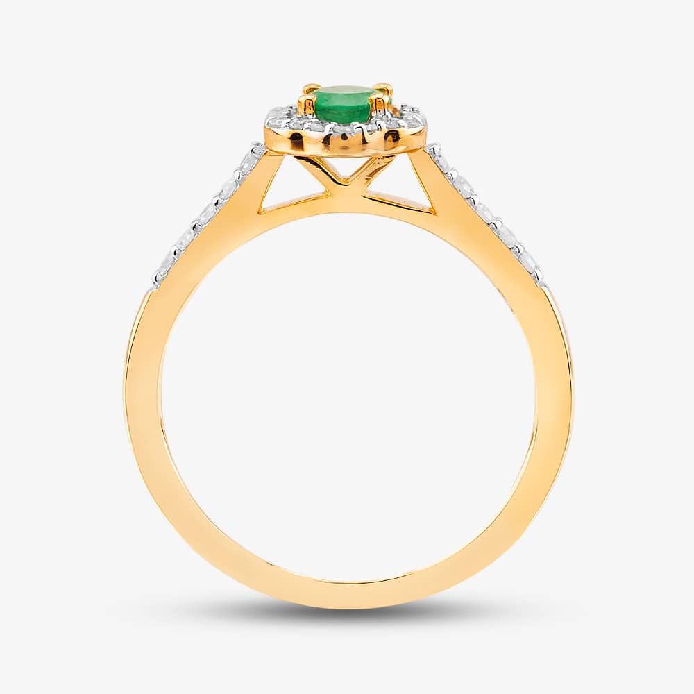 This exquisite halo ring is a masterpiece of craftsmanship. The delicate 9ct yellow gold band is set with a brilliant-cut emerald centre stone, which is surrounded by a halo of brilliant-cut white diamonds. The diamond-set shoulders add a touch of elegance, making this ring a truly stunning piece of jewellery.