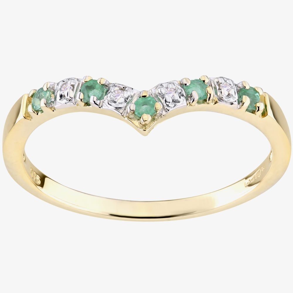 This beautiful ring has been created in 9ct yellow gold & features alternating claw set round emeralds & illusion set sparkling round diamonds in a classic wishbone design. This ring makes an ideal eternity ring & is perfect for stacking with other rings to create your own unique look.