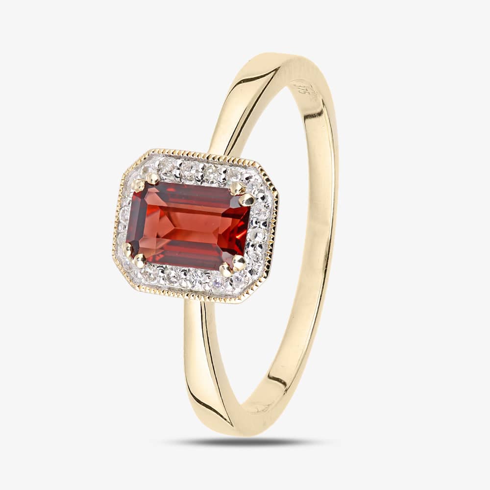 This modern cluster ring is crafted in 9ct yellow gold & features an emerald cut garnet centre stone with a sparkling diamond surround which has a total carat weight of 0.08ct & a mill grain edge design. This ring is a perfect stand-alone piece or ideal for layering & combining with other rings to create your own unique look.