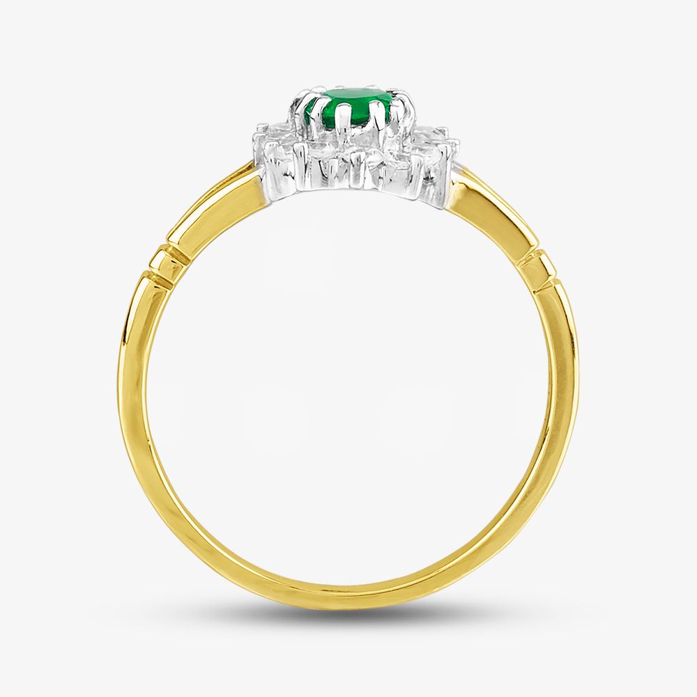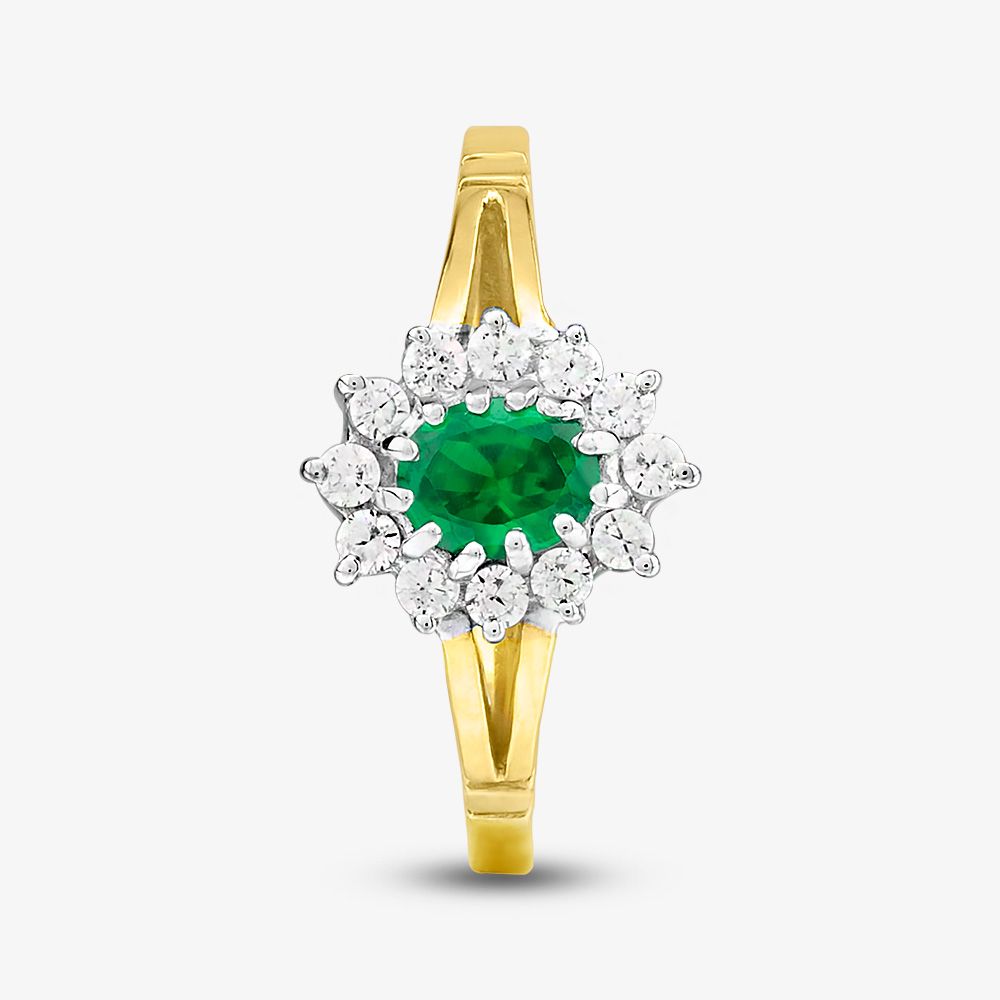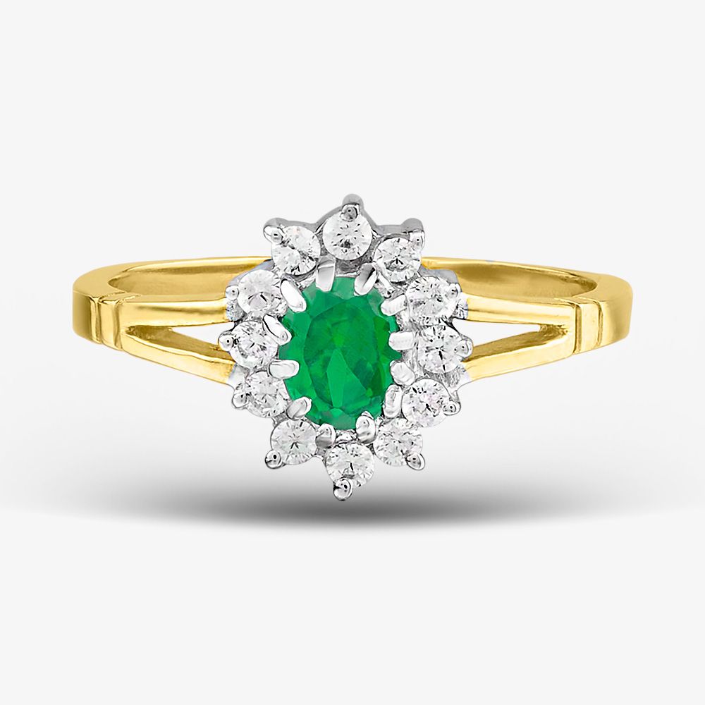 A simple yet classic cluster ring crafted in 9ct yellow gold with an oval green crystal centre stone, clear crystal surround and an open shoulder design. This ring glistens and catches the light beautifully, the perfect dress ring for that special occasion.