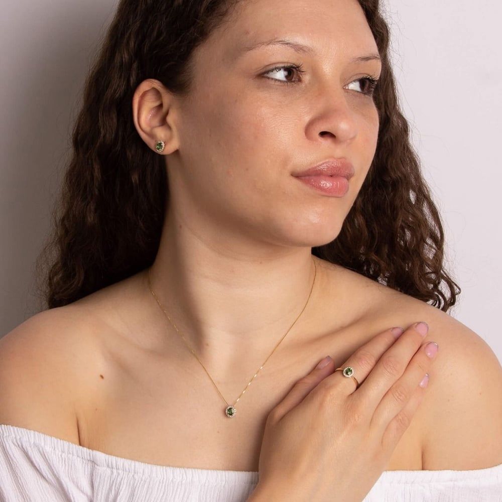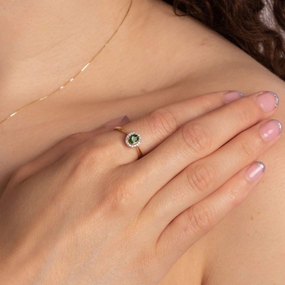A cluster ring made from 9ct yellow gold and set with 0.09ct of white diamonds. This ring also has a four claw set oval cut green tourmaline centre stone.