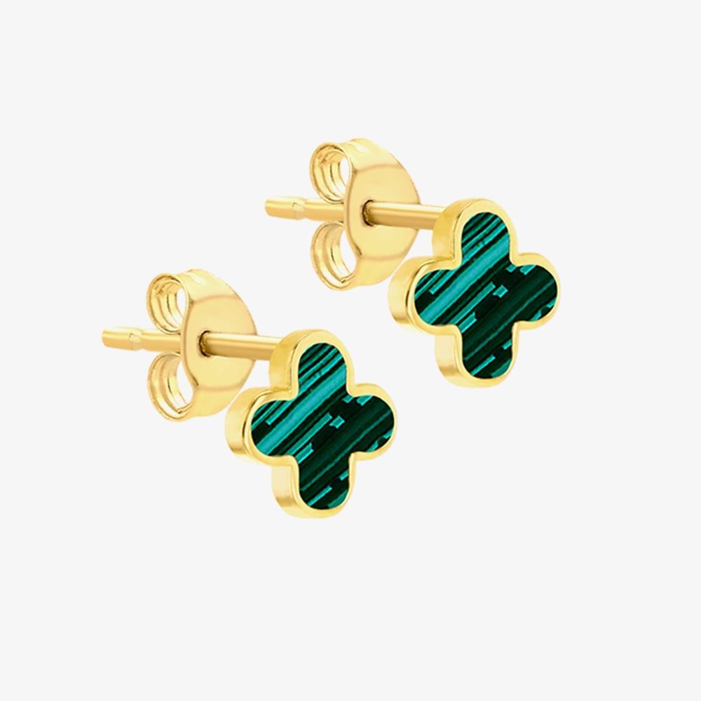 A pair of 9ct yellow gold stud earrings featuring a striking green malachite petal design. These elegant earrings highlight the rich, swirling patterns of malachite, adding a vibrant touch of colour and sophistication to any ensemble.