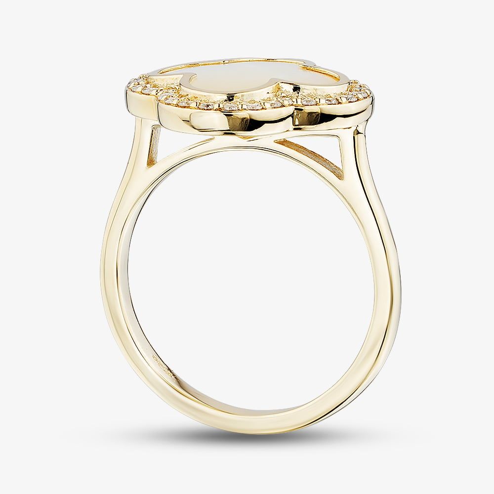 Charming and elegant, this 9ct Yellow Gold Dress Ring features a clover-shaped mother-of-pearl motif edged with polished gold and accented with a row of sparkling white round diamonds. A delicate and timeless piece, perfect for adding subtle glamour to any outfit.