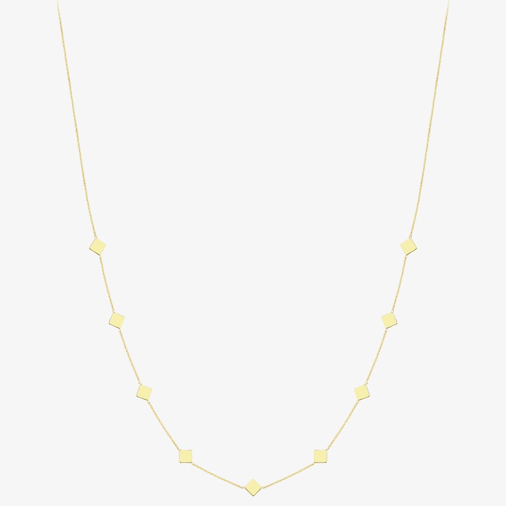 A graceful 9ct yellow gold necklace adorned with multi-shaped diamond discs that glimmer subtly. At 45cm in length and fastened with a lobster clasp, it makes a memorable gift for a loved one.