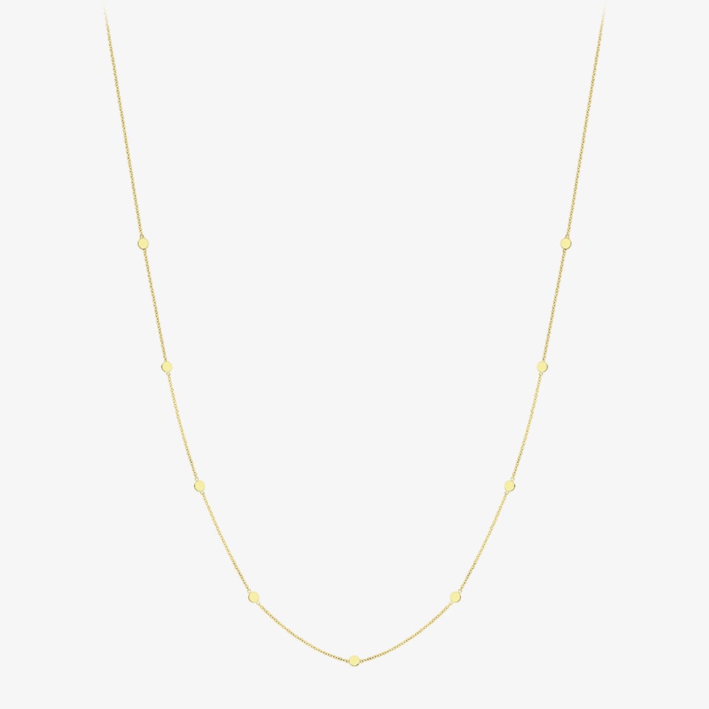 This stylish necklace is crafted from 9ct yellow gold and features multiple polished disc charms delicately spaced along the chain. With its modern, playful design, it adds a touch of effortless elegance to any outfit.