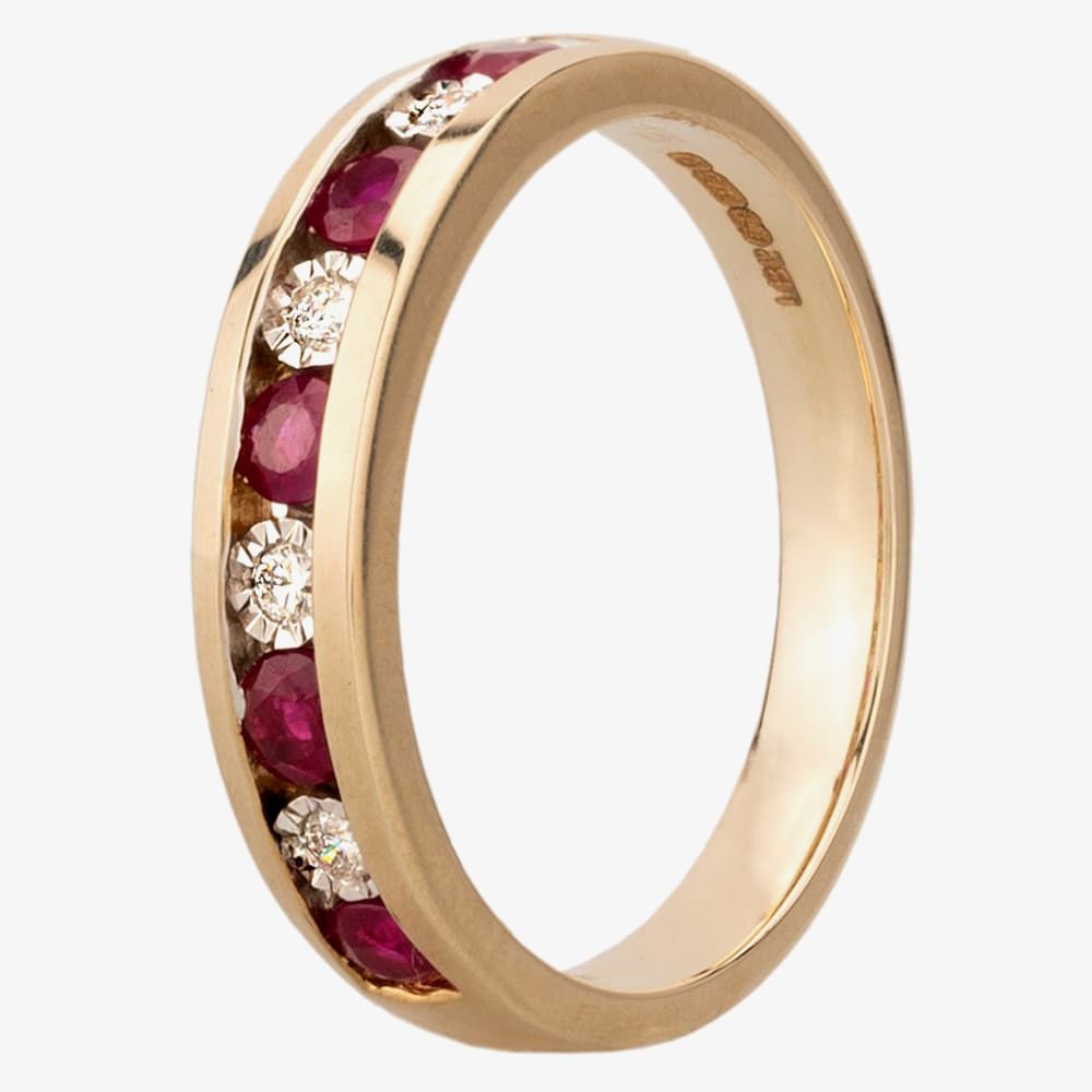 A channel-set half eternity ring with five round rubies and four illusion-set diamonds.