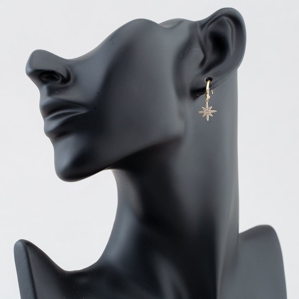 These earrings are adorned with a captivating North Star dropper filled with 20 glistening white cubic zirconia stones each. They offer a celestial touch, marrying the classic elegance of gold with the brilliance of cubic zirconia. The North Star design symbolizes guidance and aspiration, making these earrings a statement of both style and purpose