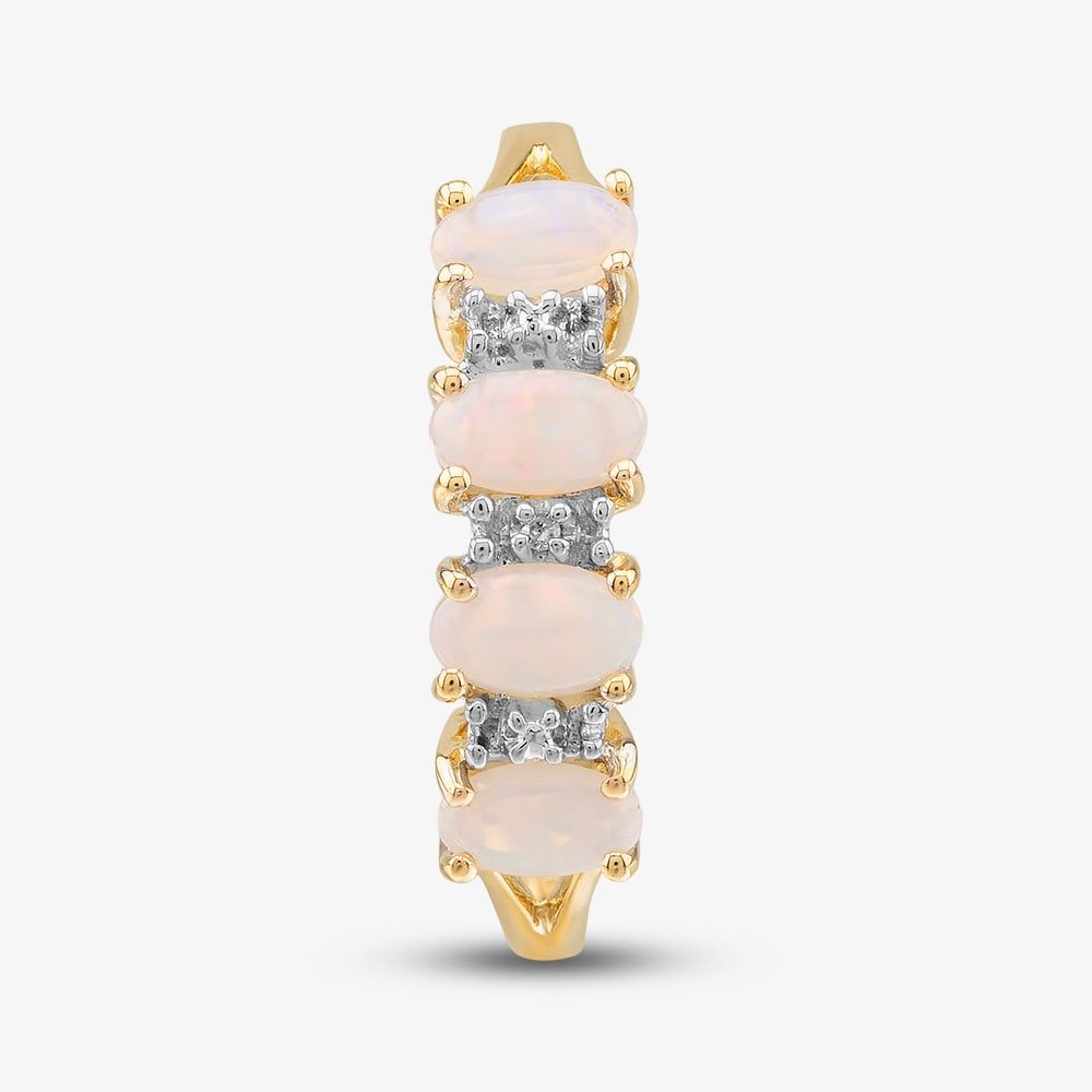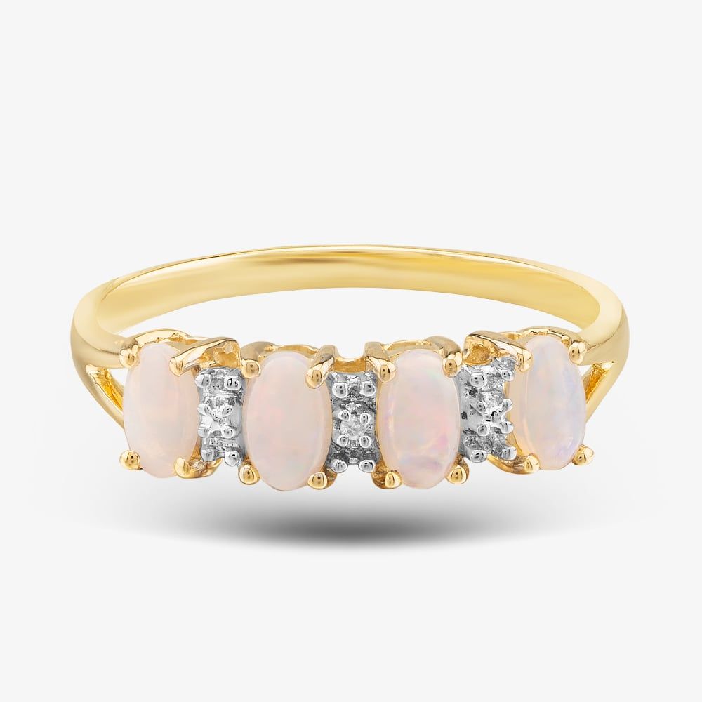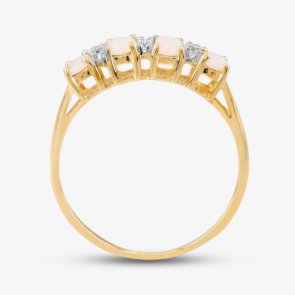 Exquisitely crafted from 9ct yellow gold, this half-eternity is a sight to behold. This beautiful ring is adorned with four oval pink opal gemstones, accentuated further with white diamonds in between each gemstone, set in a classic four-claw setting. This ring is sure to turn heads and make a statement.