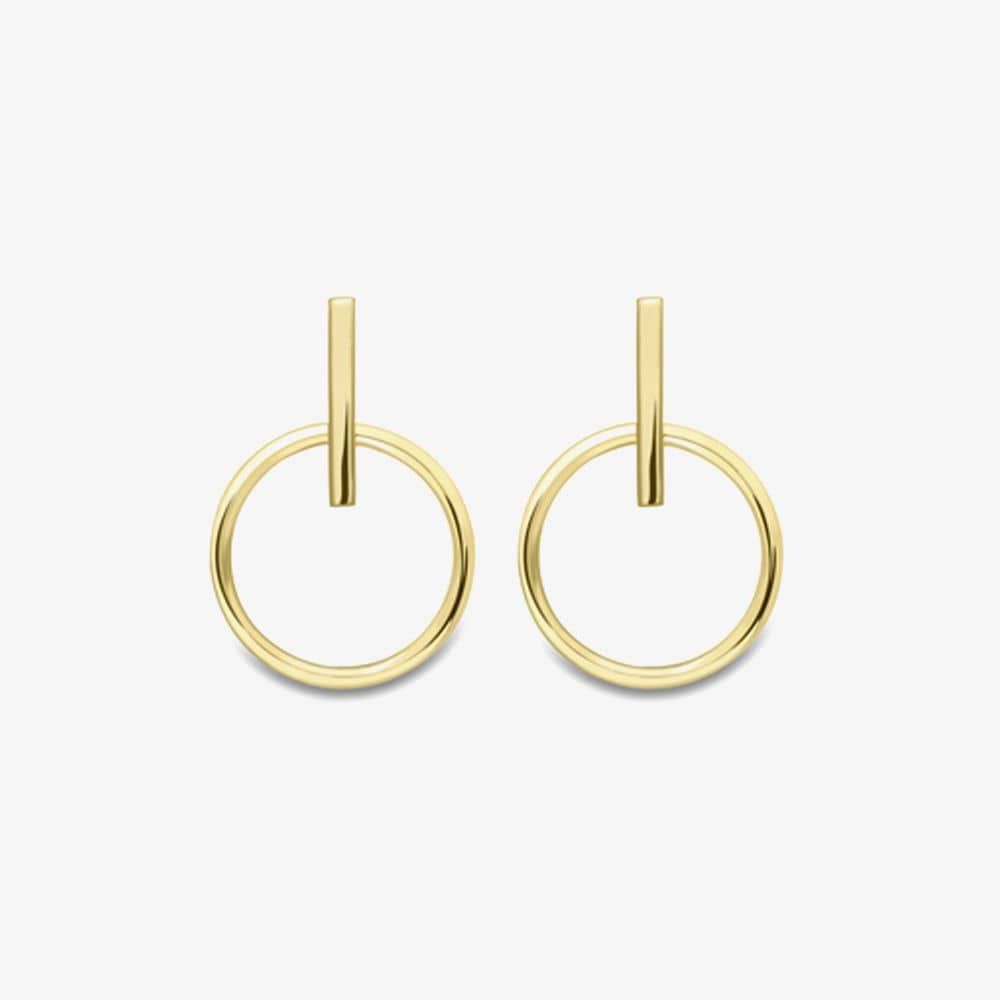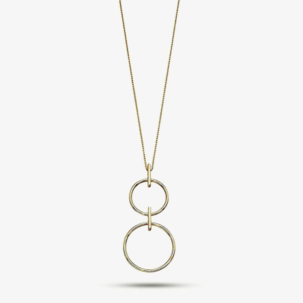 A 9ct yellow gold jewellery set composed of a pair of earrings and a matching necklace. The necklace is on a 42cm long box chain with a double open circle drop pendant, and the earrings weigh 1.4 grams and measure 15 x 15mm.