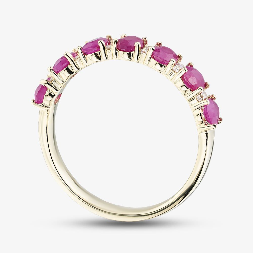 Half eternity rings are a popular choice for celebrating a milestone or new baby. Perfectly complementing each other, this ring features a row of oval shaped rubies each separated by two brilliant cut diamonds for enhanced sparkle, creating a timeless design suitable for every day wear. Set onto a classic shaped band crafted from fine 9ct yellow gold.