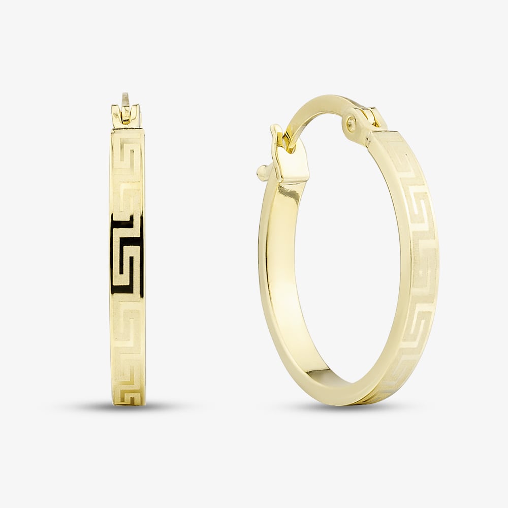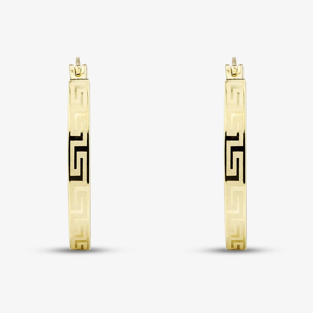 Crafted from fine 9ct yellow gold these classic hoop earrings have a contemporary twist with a square edge design and Greek key style pattern. Complete with hinge click mechanisms for a secure and comfortable fit. Suitable for every day wear, these earrings are perfect for gifting or adding to your own jewellery collection.