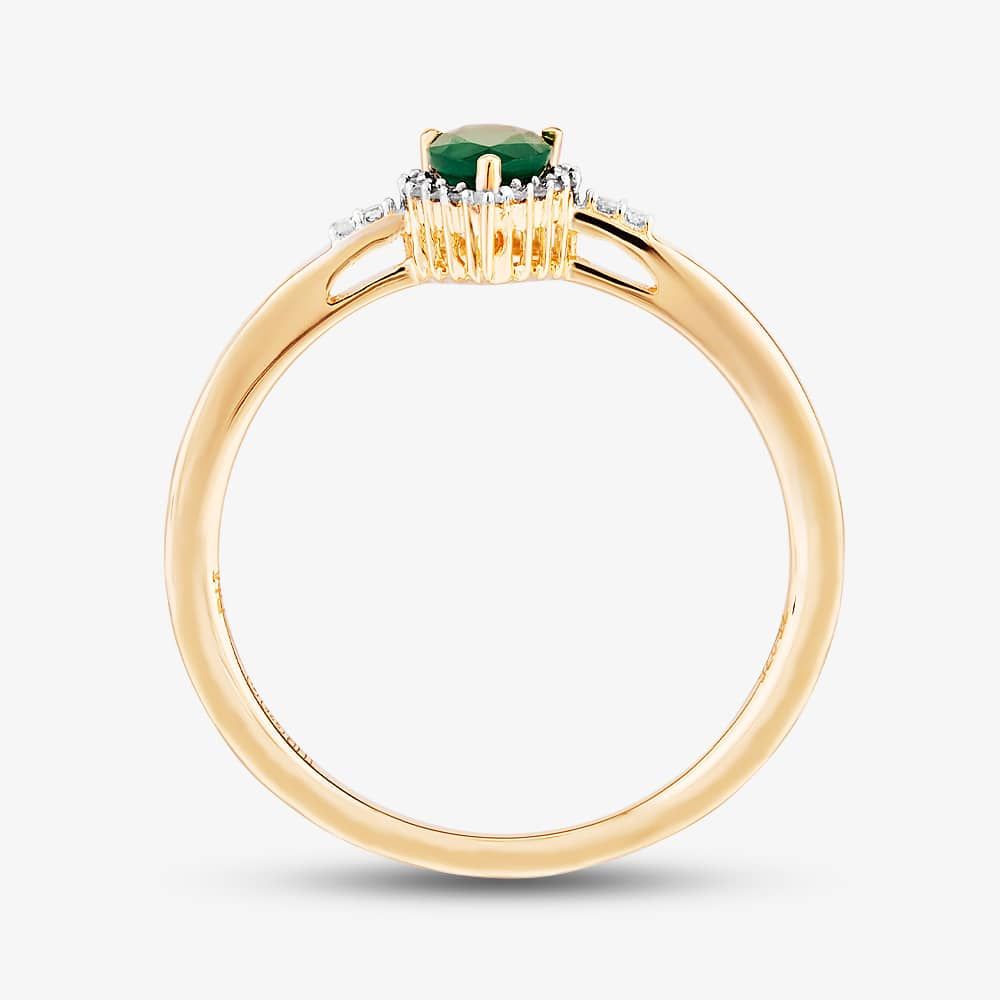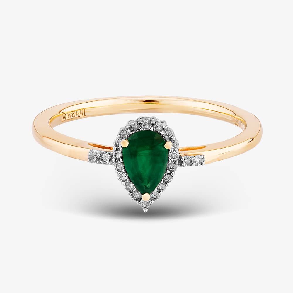 Gemstone cluster rings are a colourful and cost-effective substitute for more pricey diamond rings. A beautifully hued pear-cut emerald is framed by a halo of brilliant diamonds for a cut and colour contrast, all held in place by a clawed arched setting and supported by raised stone-set open shoulders.