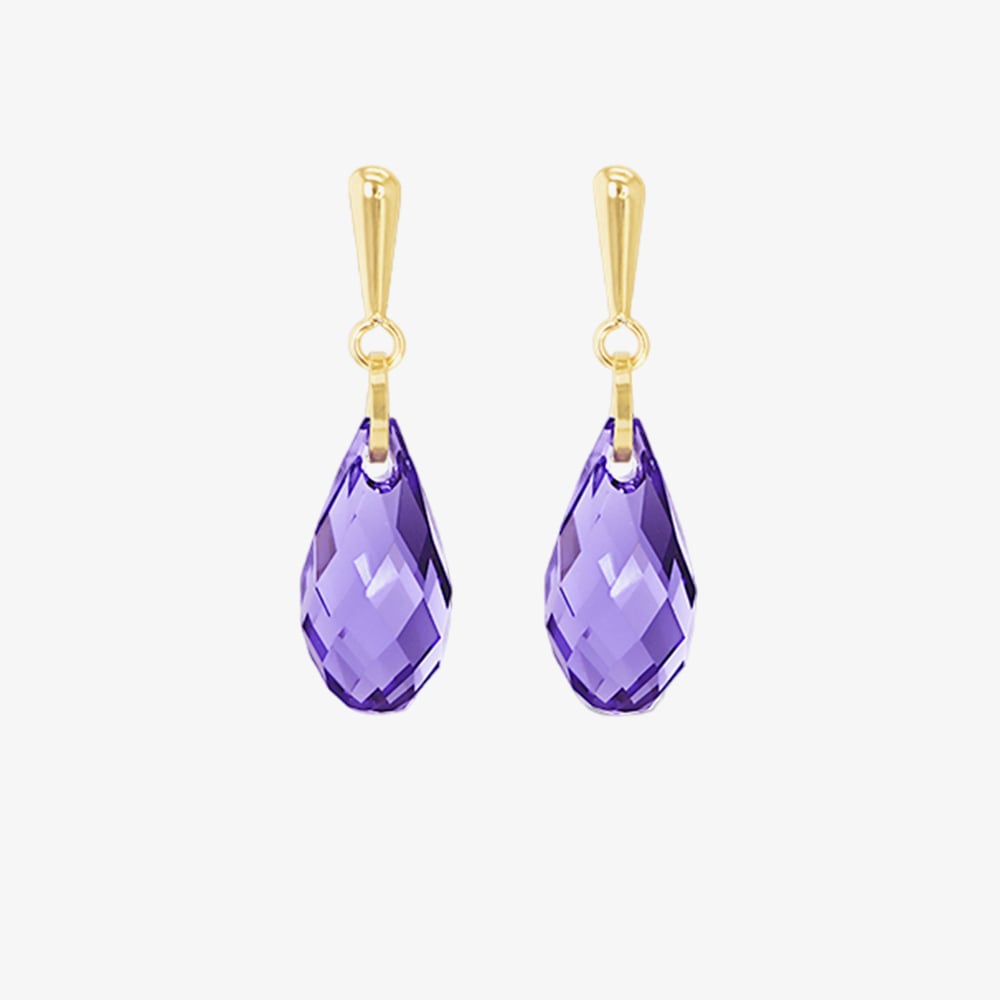 A pair of 9ct yellow gold drop earrings featuring a stunning purple crystal. The elegant drop design enhances the vibrant hue of the crystal, adding a touch of sophistication and charm, perfect for both casual and formal occasions.