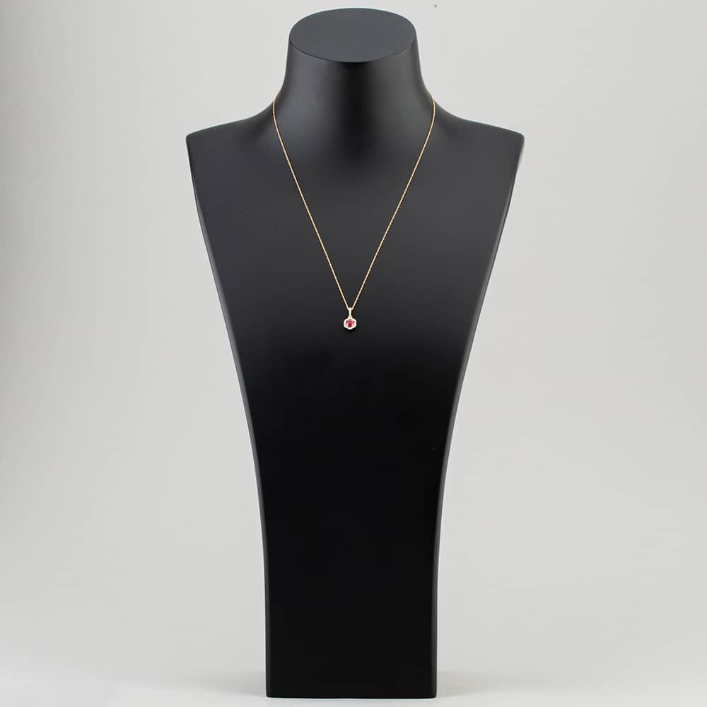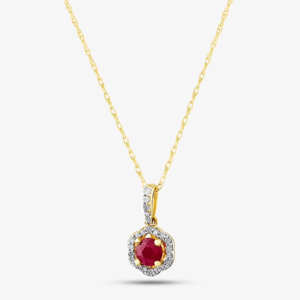 This exquisite necklace is a masterpiece of craftsmanship. The brilliant-cut ruby at its centre is surrounded by a halo of sparkling white brilliant-cut diamonds, creating a truly stunning piece. The diamond-set bail adds a touch of sophistication, with a total weight of 0.09ct making this necklace a must-have for any jewellery collection. The pendant is suspended on a 9ct yellow gold belcher chain, which is both timeless and stylish. This is a truly unique and special piece of jewellery that is sure to turn heads.
