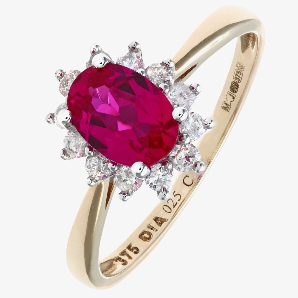 This beautiful cluster ring is crafted in 9ct yellow gold & features an oval ruby centre stone with a sparkling diamond surround which has a total carat weight of 0.25ct. This ring is a perfect stand-alone piece or ideal for layering & combining with other rings to create your own unique look.