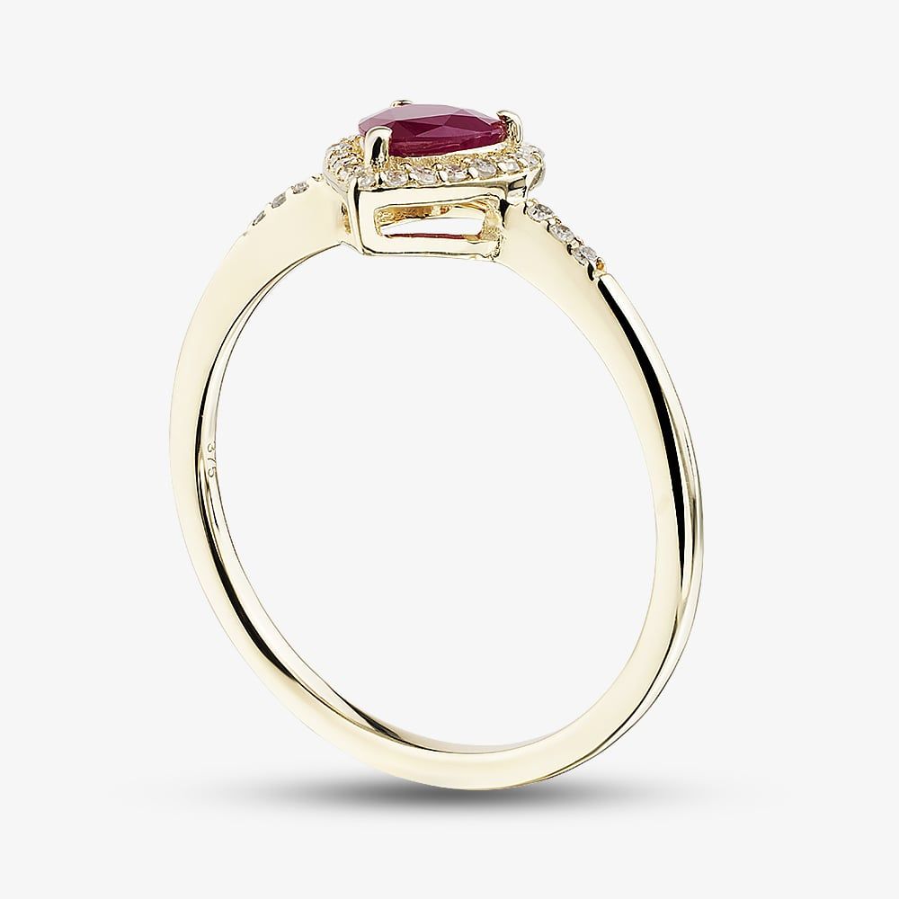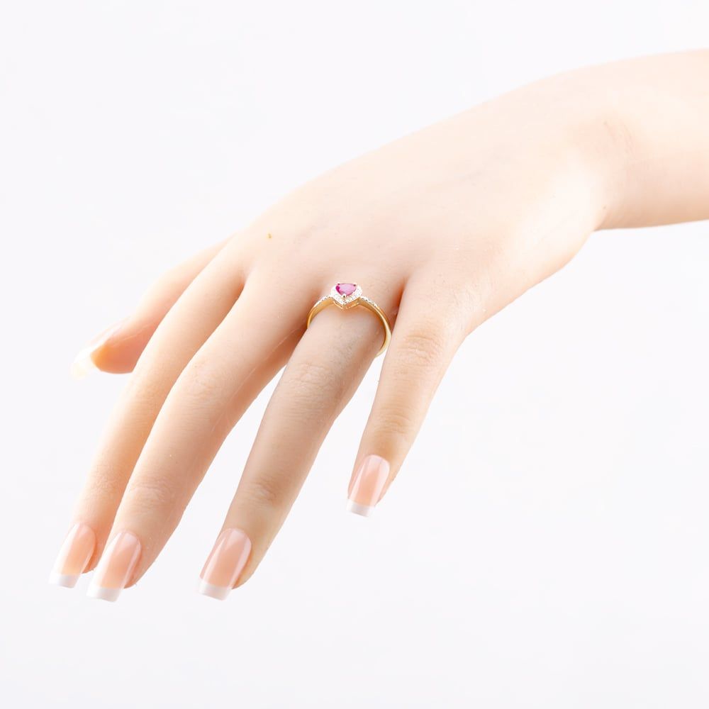 A heart shaped showstopping ruby sits at the heart of this cluster ring securely in a three claw setting. An array of sparkling white, brilliant cut diamonds cradle the centre stone and detail the shoulders for added brilliance. Set onto a classic shaped band crafted from fine 9ct yellow gold, this ring is perfect for marking a special occasion or gifting a loved one.