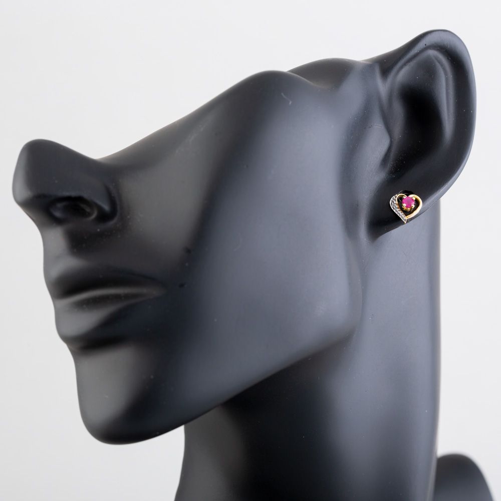 This beautiful pair of 9ct yellow gold stud earrings feature an open-heart design with a mesmerising red ruby in the centre and is enhanced with brilliant-cut white diamonds.
