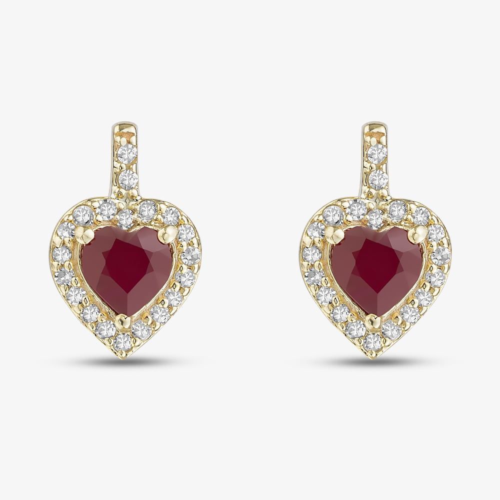 Elevate your evening style with these glamorous stud earrings crafted from fine 9ct yellow gold. A heart-shaped ruby sits at the centre of each, surrounded by an array of sparkling, round-cut diamonds totalling 0.12ct to maximise sparkle. Complete with post and butterfly fastenings for a secure and comfortable fit, these earrings are a special gift to celebrate any occasion.