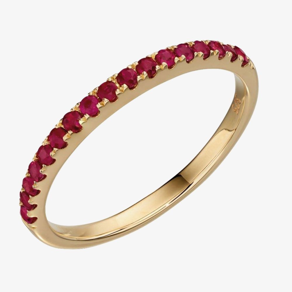 This scalloped edge half eternity ring is set with seventeen identical round rubies, making this piece perfect for adding a pop of colour to an existing bridal set, stacking with other dress rings or wearing alone.