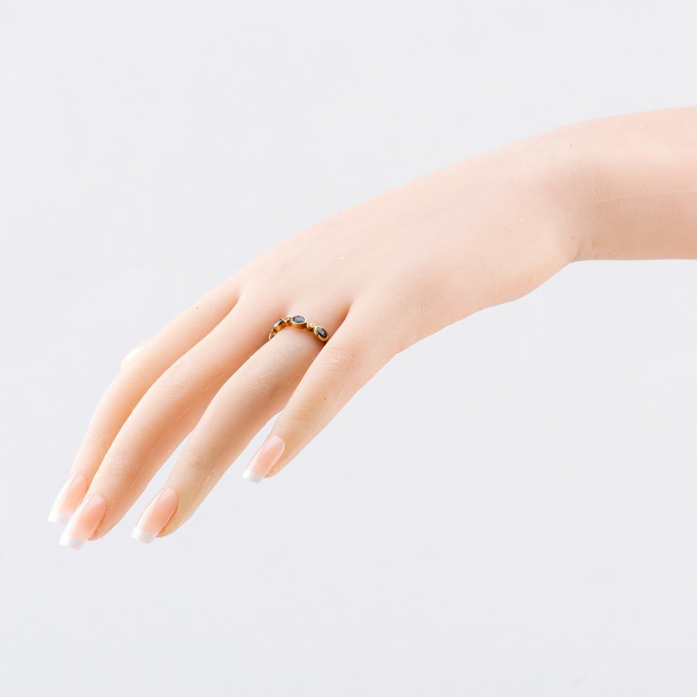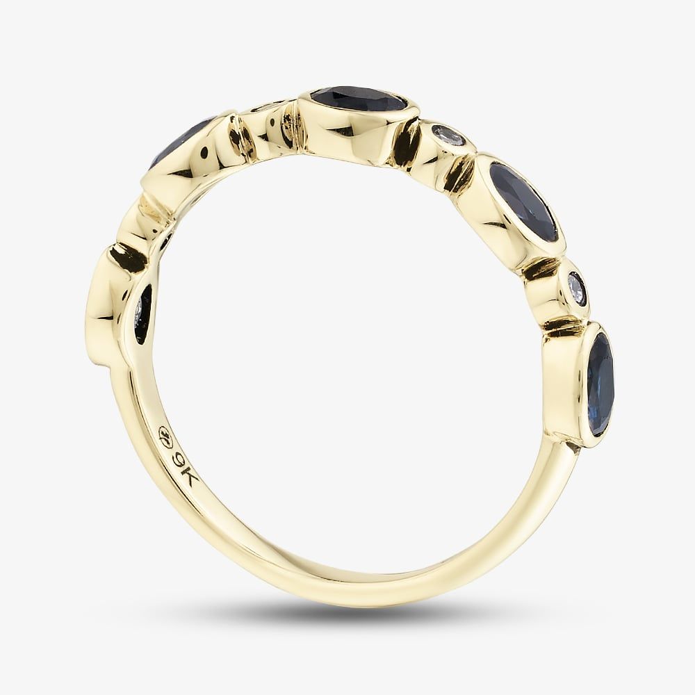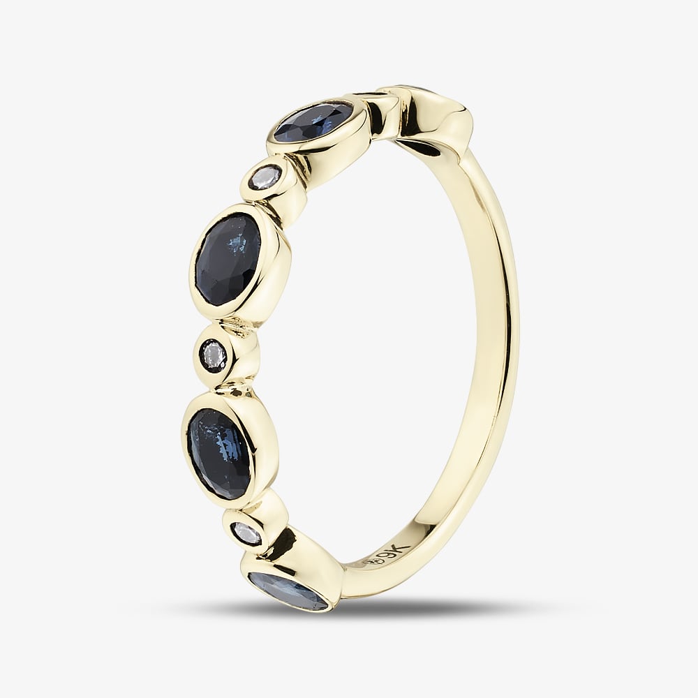 Alternating oval blue sapphires and round-cut white diamonds sit beautifully in a bezel setting that offers maximum protection for the gems, whilst offering a sleek and modern look. Set onto a polished, classic shaped band crafted from 9ct yellow gold, this glamorous half eternity ring is a symbol of love and commitment and is perfect for celebrating milestones like anniversaries and the birth of a child.