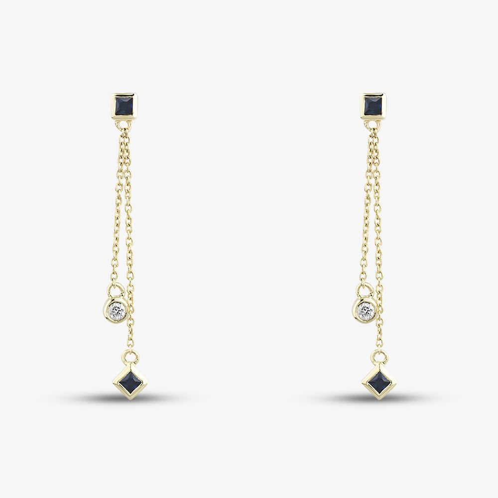 Add contemporary design to your evening style with this stunning pair of dropper earrings crafted from fine 9ct yellow gold. Featuring a two-stand chain design set with blue sapphires and diamonds, each stone is bezel set for maximum stone protection, without compromising on glamour. Gift a loved one to mark a special occasion.