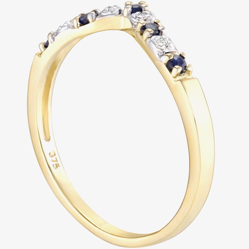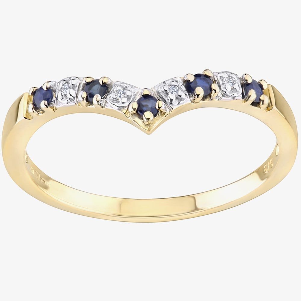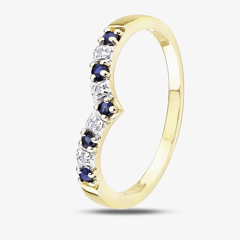 This beautiful ring has been created in 9ct yellow gold & features alternating claw set round sapphires & illusion set sparkling round diamonds in a classic wishbone design. This ring makes an ideal eternity ring & is perfect for stacking with other rings to create your own unique look.