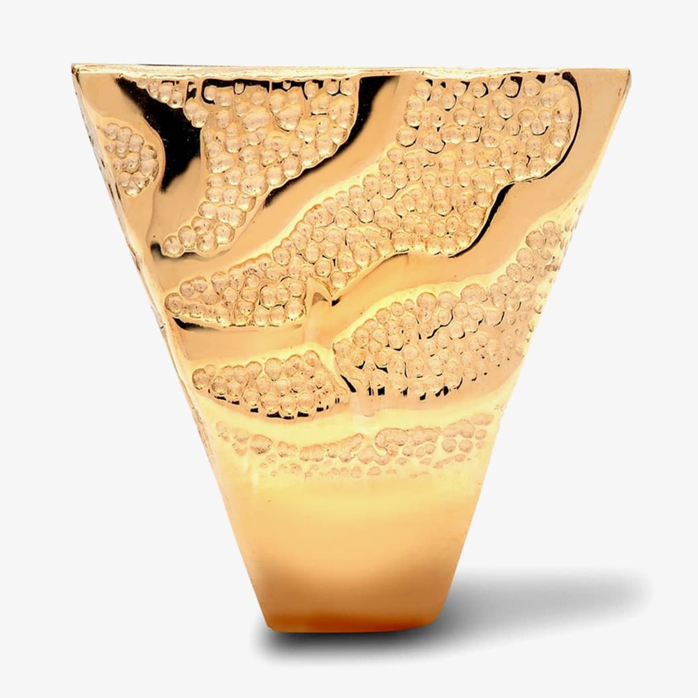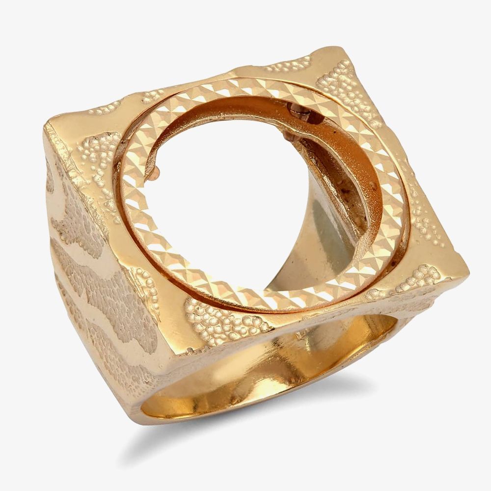 This stunning 9ct yellow gold sovereign ring is the perfect addition to your collection. The ring features a distinctive patterned design with square-shaped shoulders and a circular textured setting perfect for your own half sovereign coin to add a personalised touch.