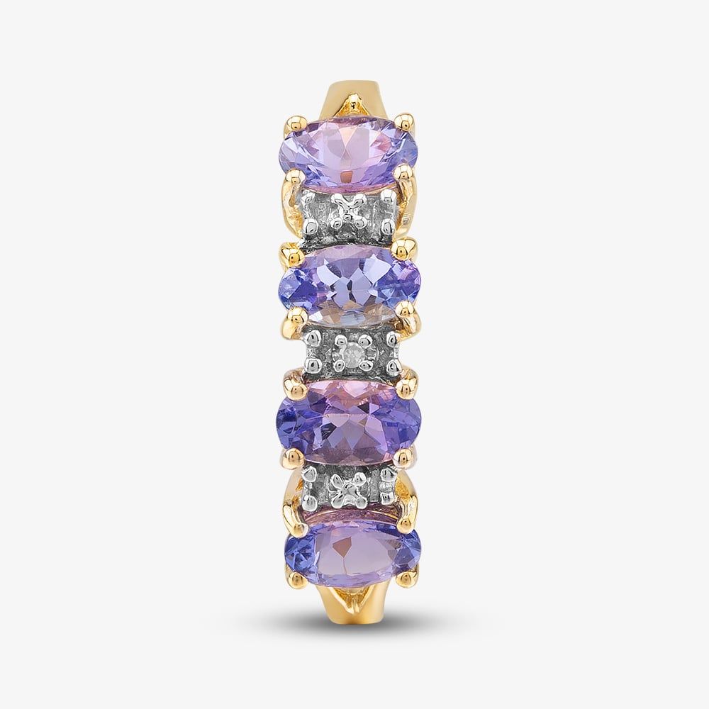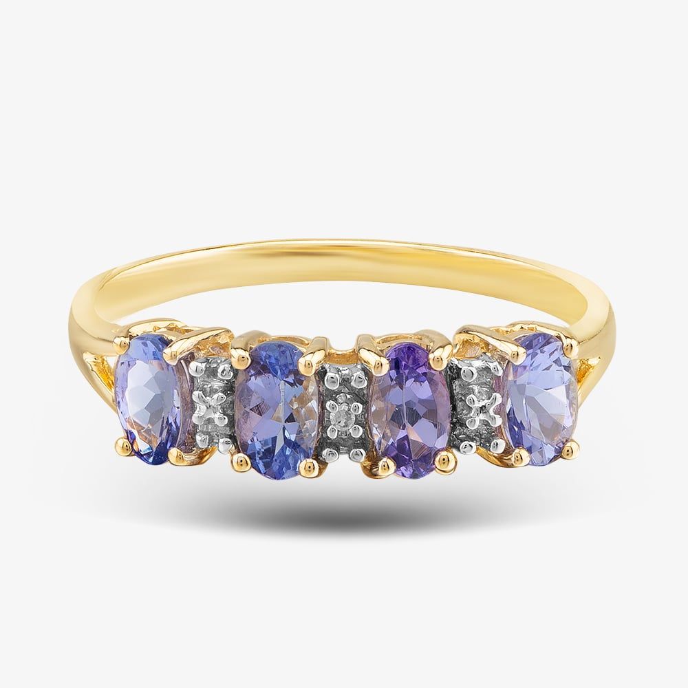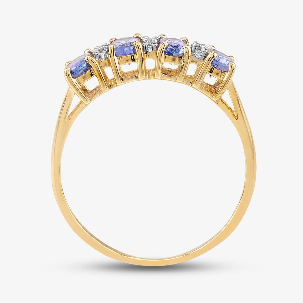 This beautiful ring has been created in 9ct yellow gold & features four oval cut claw set tanzanite stones with a round claw set sparkling diamond in the centre. This ring makes an ideal eternity ring & is perfect for stacking with other rings to create your own unique look.