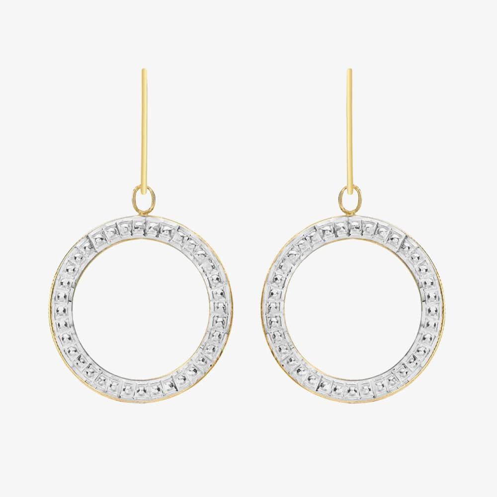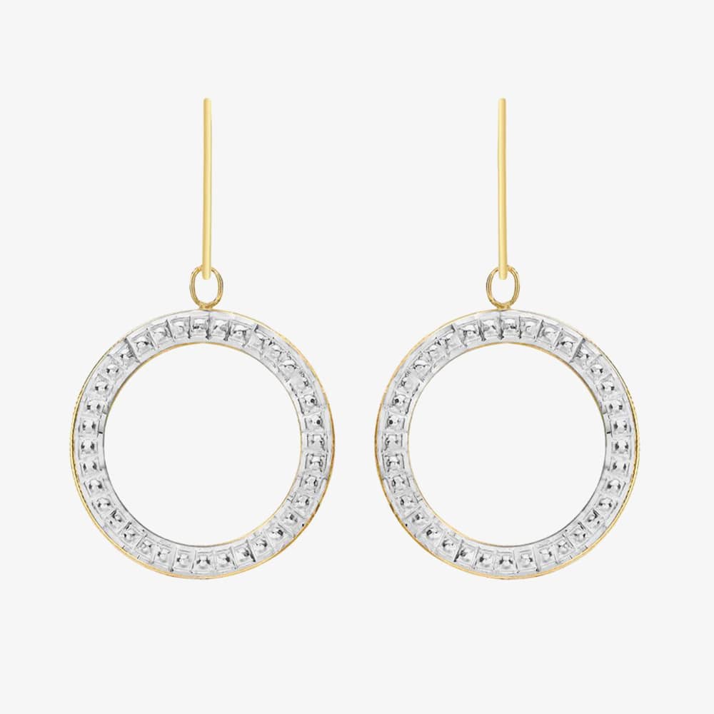 These exquisite 9ct yellow gold dropper earrings showcase a stunning textured open circle design, delicately plated in white gold for an added touch of elegance. Each earring features a captivating contrast between the warm glow of the yellow gold and the lustrous shine of the white gold plating, creating a striking visual effect.