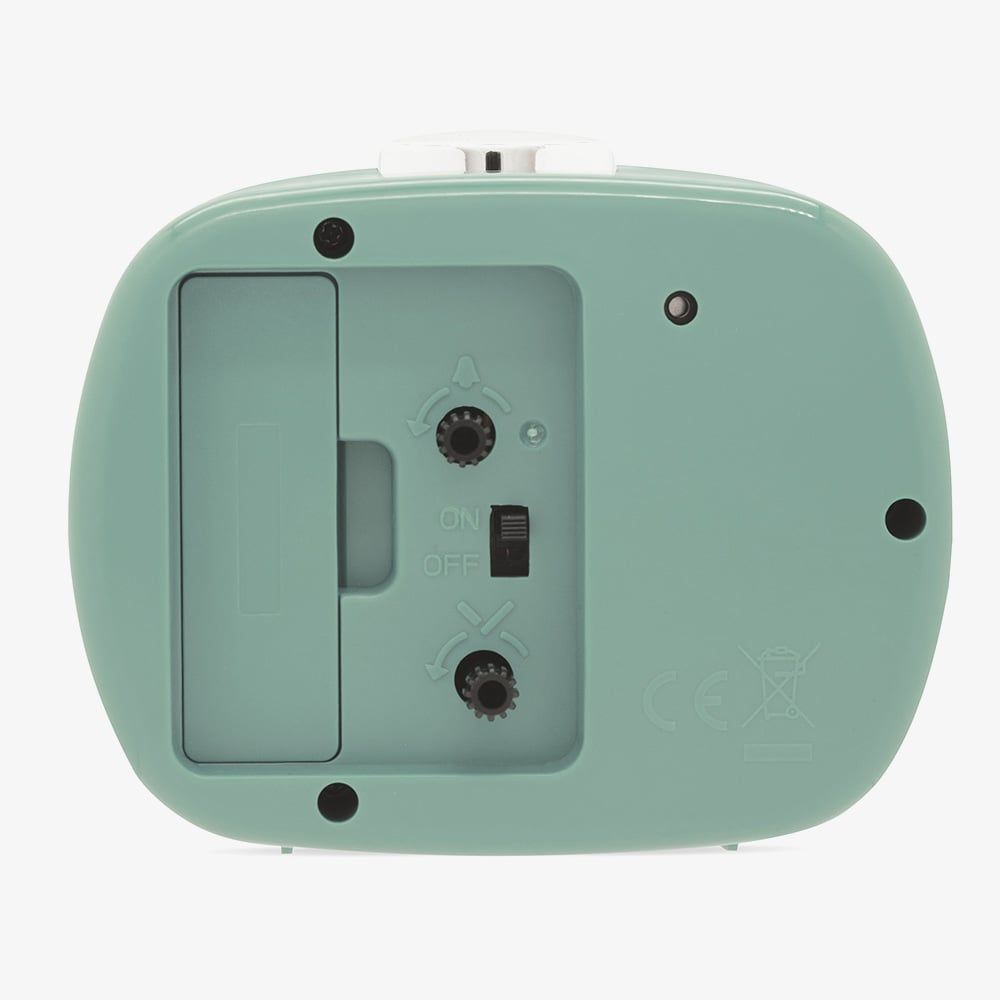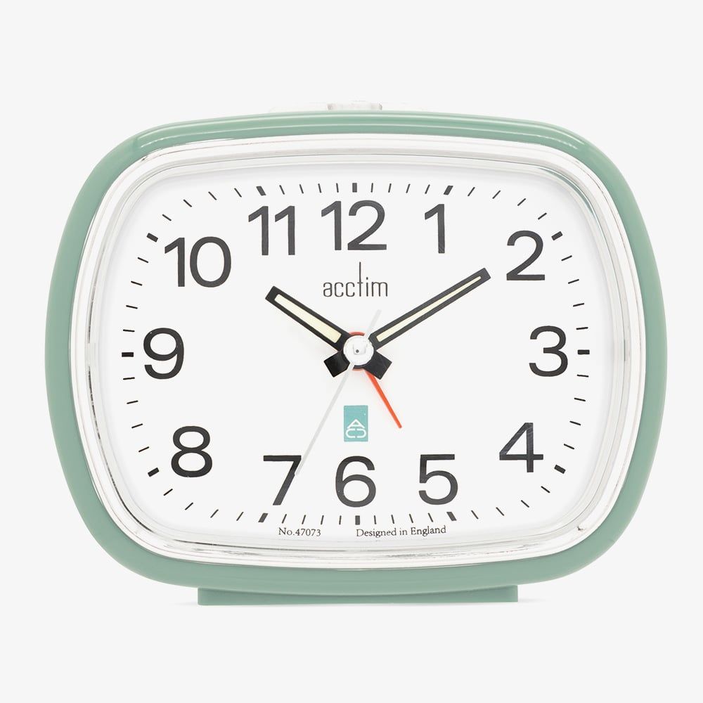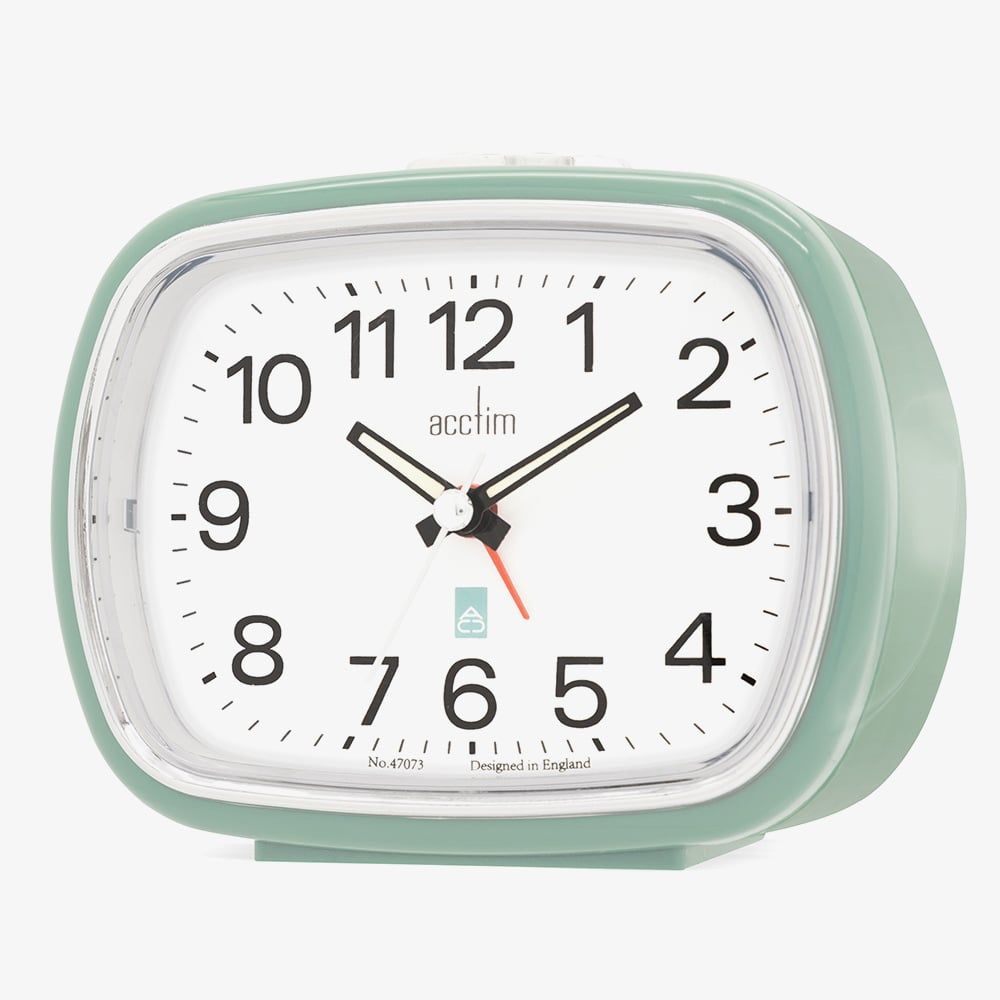 Classic and easy to read, the Acctim Camille Alarm Clock features a sage green plastic case with a white dial, luminescent hands, and large number hour markers for clear visibility. Battery operated, it offers reliable timekeeping with timeless style for any bedside or desk.