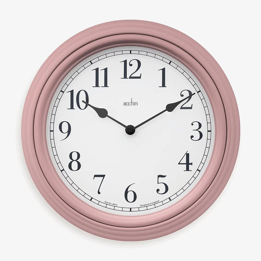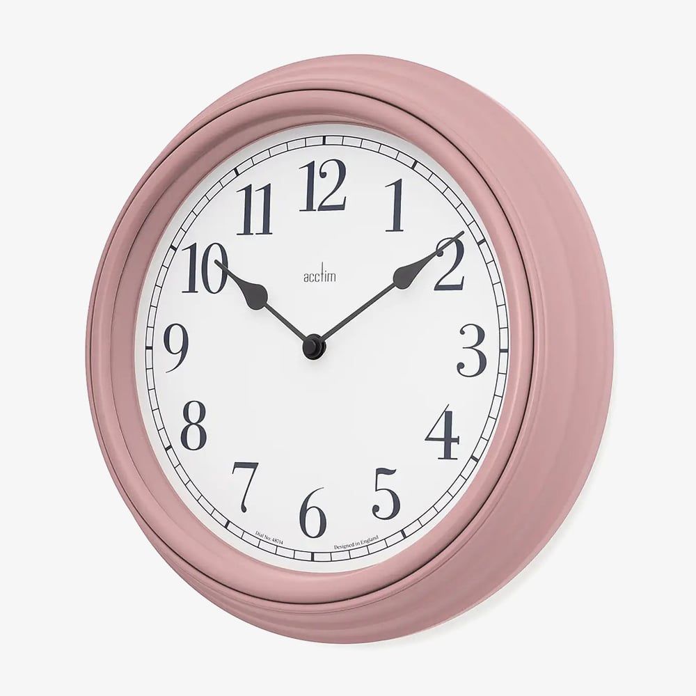 Acctim Devonshire Pink Wall Clock – A classic timepiece featuring a clean white dial with easy-to-read numerals, set in a soft cream case. Its timeless design adds a touch of elegance to any room.