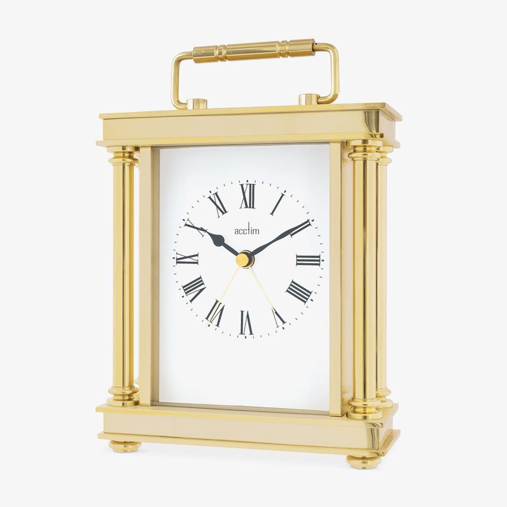 Acctim Marlow Gold Carriage Clock – Inspired by Greek Revival design, this Doric-style mantel clock features a sleek gold metal case and a clear, uncluttered white dial for a timeless, elegant look.
