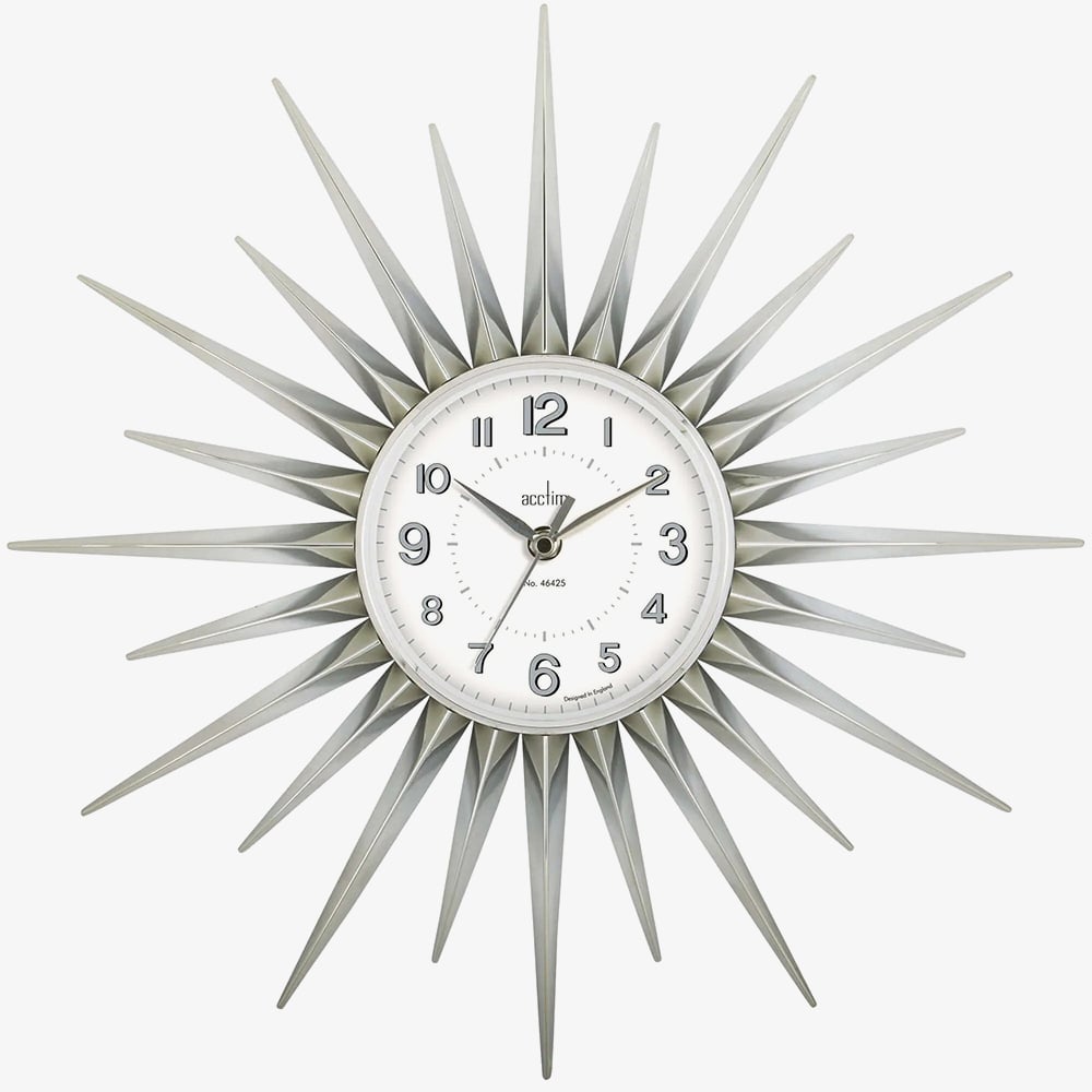 Acctim Stella Silver Chrome Starburst Wall Clock – A striking retro-inspired design, the Stella features a dazzling starburst shape in sleek silver chrome. Perfect for adding a bold, mid-century modern touch to any space.