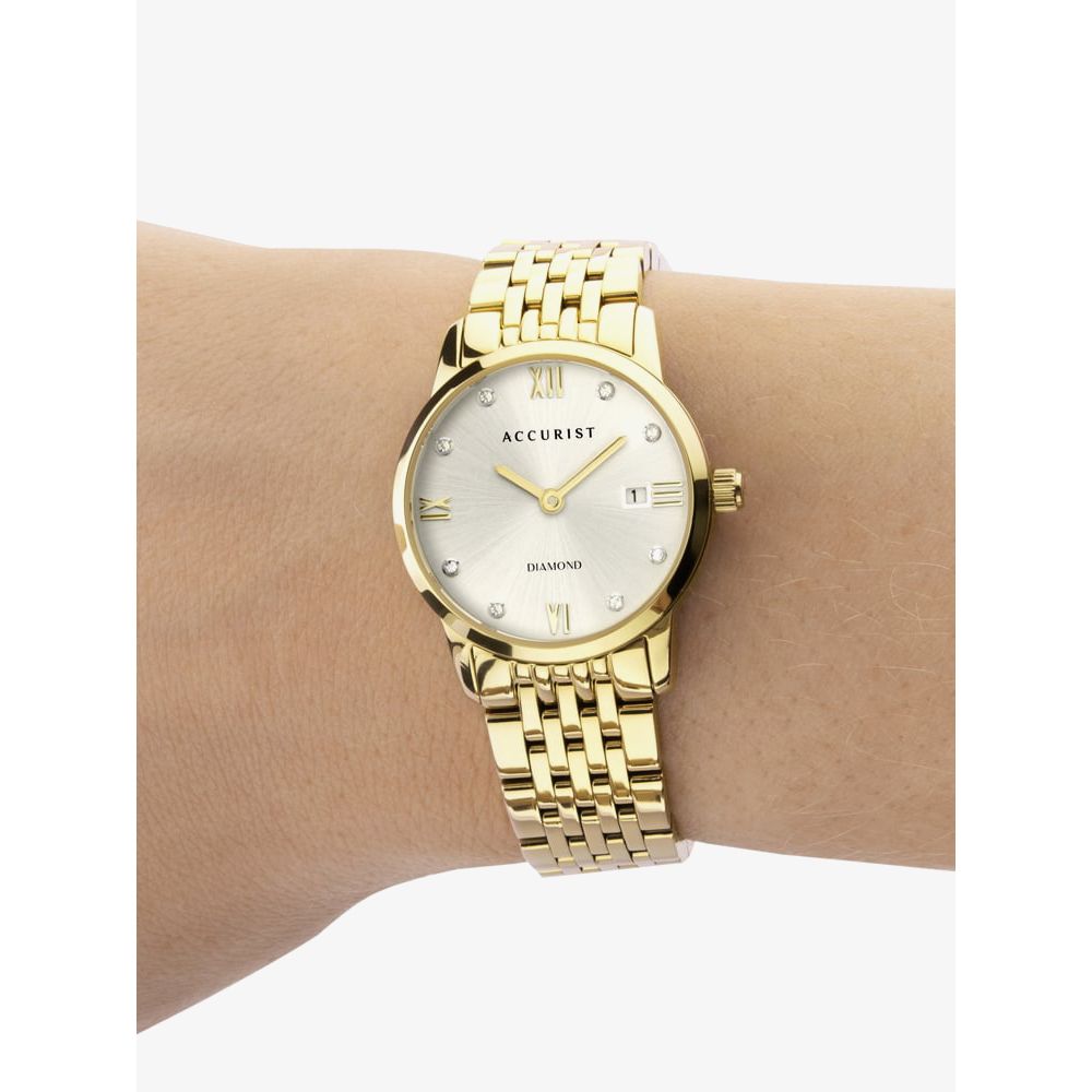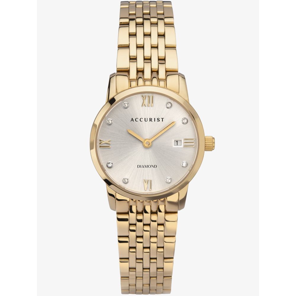 This signature diamond timepiece from Accurist will add a sparkling finish to your look. 8 exquisite diamonds are set upon a silver sunray dial which is further accentuated by gold plated Roman numeral hour markers and hands. The piece is finished with a date window at 3 o’clock and a gold plated stainless steel bracelet.