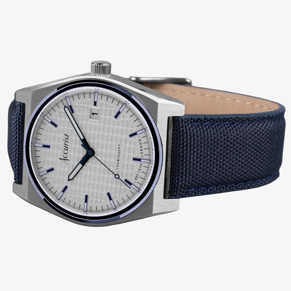 Inspired by Accurist’s bestselling 1970s design, this watch features a white block-textured dial with a date display and the signature lollipop second hand, protected by ultra scratch-resistant sapphire crystal. Housed in a round silver and blue stainless steel case, it’s finished with an interchangeable navy canvas strap and offers water resistance up to 100 metres.