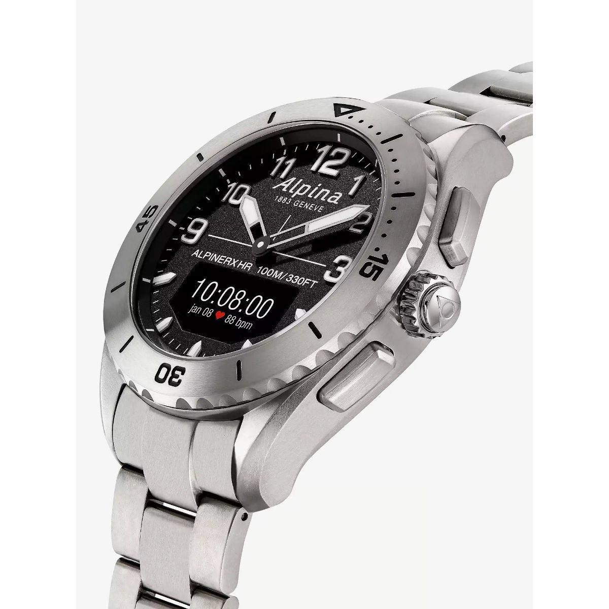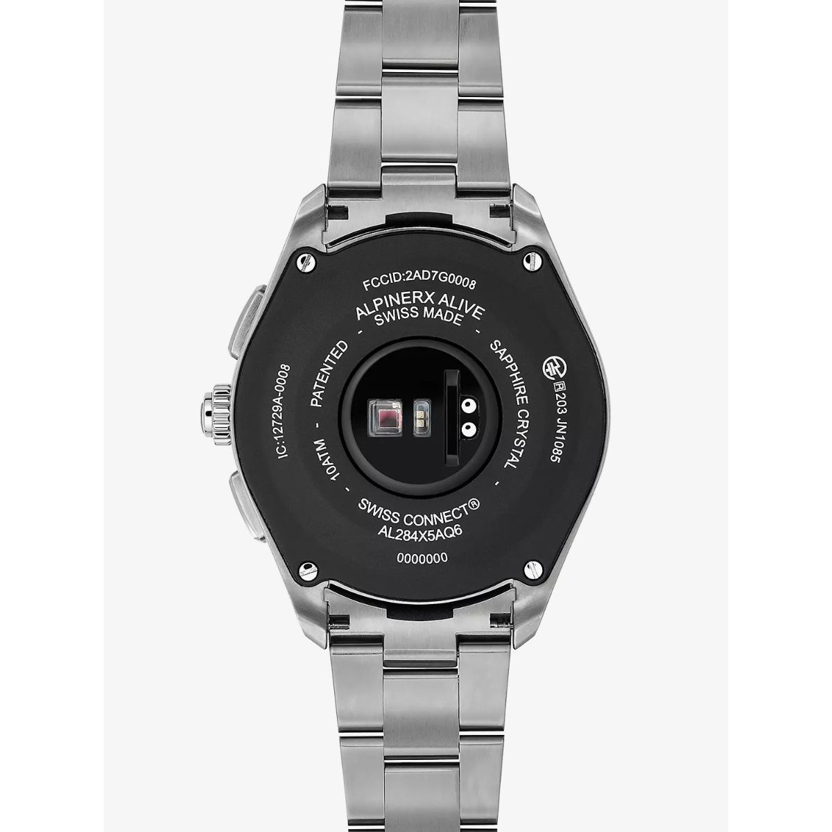 The ALPINA AlpinerX Alive Titanium AL284LBBW5TAQ1B smartwatch combines a round shaped titanium case and silver Stainless-steel bracelet with a push button deployment clasp. It has a black dial which is protected beneath sapphire crystal glass and features a LED screen which turns off when not in use. Power is generated by the rechargeable battery that has a 7-day battery life. This model also has a water resistance of up to 100 metres.