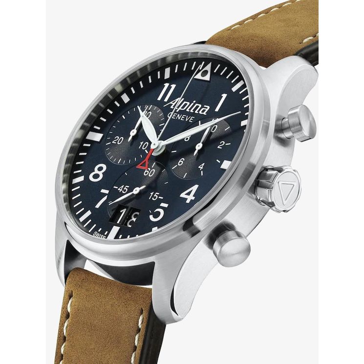 Watches and Wonders The Alpina Mens Startimer Pilot Blue Dial Chronograph AL-372N4S6 watch combines a 44mm round shaped stainless steel case and brown leather strap with a traditional buckle. It has a blue analogue dial which is protected beneath sapphire crystal glass. Power is generated by the quartz movement. This model also has a water resistance of up to 100 metres.Watch also Features a Alpine Engraving on the back of the case Alpinahttps://www.thbaker.co.uk/media/catalog/product/2/5/25-27-006_02.jpghttps://www.thbaker.co.uk/media/catalog/product/2/5/25-27-006_03.jpg7688200243804add-to-cartcondition:Nodisc_no_stock:Yesex_display:Nosearch_keywords:waterproofNoYesNowaterproof2527006AlpinaAL-372N4S6MensOfficial Alpina Packaging2 Year Alpina WarrantyChronographNoWatchBrownLeather StrapStainless SteelRound12.0mm44mmAnalogueSapphire Crystal GlassBlue100 metresQuartzPin BuckleNoNoYesNoYesYesNoAlpina Mens Startimer Pilot Blue Dial Chronograph Watch 25-27-0062022-05-16 00:00:00[]2022-05-16