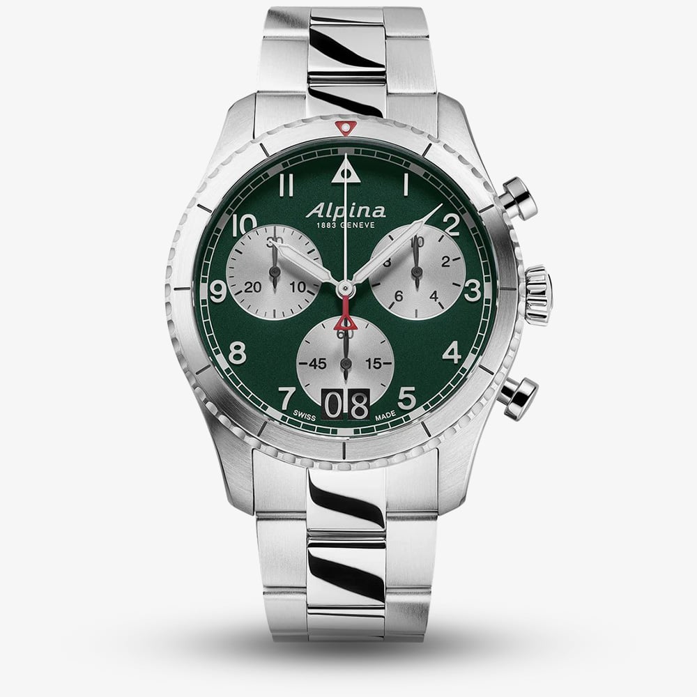 The Startimer Pilot Quartz Chronograph Big Date features a 41mm stainless steel case and bracelet, paired with a striking green dial. Powered by a precise quartz movement, it offers hours, minutes, seconds, chronograph functionality, and a bold big date display at 6 o’clock.